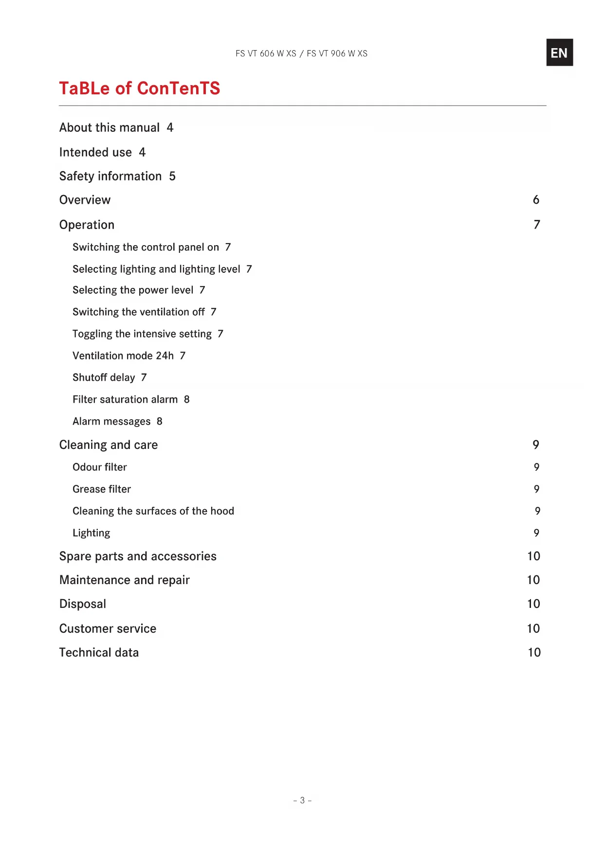 Table of ConTenTs About this manual 4 Intended use 4 Safety information 5 Overview 6 Operation 7 Switching the control panel on 7 Selecting lighting and lighting level 7 Selecting the power level 7 Switching the ventilation off 7 Toggling the intensive setting 7 Ventilation mode 24h 7 Shutoff delay 7 Filter saturation alarm 8 Alarm messages 8 Cleaning and care 9 Odour filter 9 Grease filter 9 Cleaning the surfaces of the hood 9 Lighting 9 Spare parts and accessories 10 Maintenance and repair 10 Disposal 10 Customer service 10 Technical data 10FS VT 606 W XS / FS VT 906 W XS – 4 –