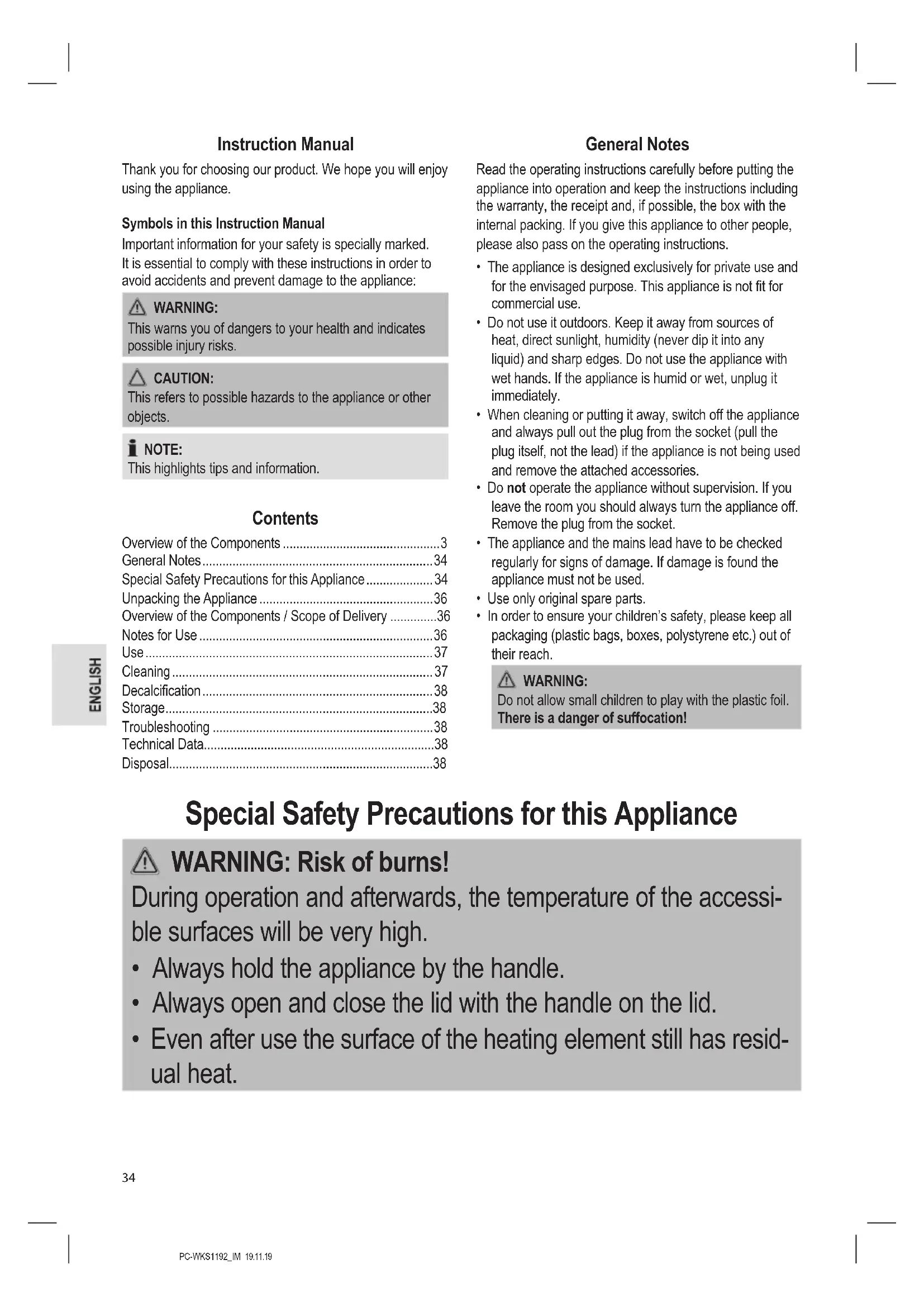 - Always store the appliance out of the reach of children in a dry, well ventilated place. Mains Cable Take-Up Appliance The mains cable can be wound up on the base. Troubleshooting Problem Possible Cause Remedy It is not possible to switch the appliance on. The appliance has no power supply. Check the socket with another appliance. Plug in the mains plug correctly. Check the main circuit breaker. The appliance is faulty. Contact our service centre or a specialist. After being used without or with too little water the appliance has not cooled down sufciently. Allow the appliance to cool down for 15 min. The appliance switches off before the water has boiled. The heating base is severely calcied or the electric circuit of the socket is overloaded. Descale the appliance as instructed. Check the mains connection. The appliance does not switch off. The lid is not closed or the lter has not been inserted. Close the lid until it locks into place, and / or reinsert the lter. The appliance will turn on automatically when being placed onto the base. The switch is turned on. Set the switch to O. Technical Data Model:.............................................................. PC-WKS 1192 Power supply:.....................................220 - 240 V~, 50 / 60 Hz Power rating: .................................................... 1850 - 2200 W Protection class: ..................................................................... Capacity: .................................................................max. 1.7 ℓ Net weight: ..................................................... approx. 1.28 kg The right to make technical and design modications in the course of continuous product development remains reserved. This appliance has been tested according to all relevant current CE guidelines, such as electromagnetic compatibility and low voltage directives, and is manufactured according to the latest safety regulations. Disposal Meaning of the “Dustbin” Symbol Protect our environment: do not dispose of electrical equipment in the domestic waste. Please return any electrical equipment that you will no longer use to the collection points provided for their disposal. This helps avoid the potential effects of incorrect disposal on the environment and human health. This will contribute to the recycling and other forms of re-utilisation of electrical and electronic equipment. Information concerning where the equipment can be dis- posed of can be obtained from your local authority.PC-WKS1192_IM 19.11.19