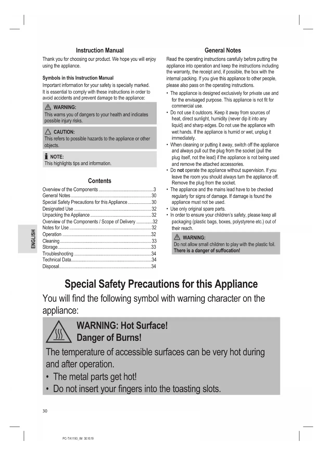 - Do not insert your ngers into the toasting slots.PC-TA1193_IM 30.10.19