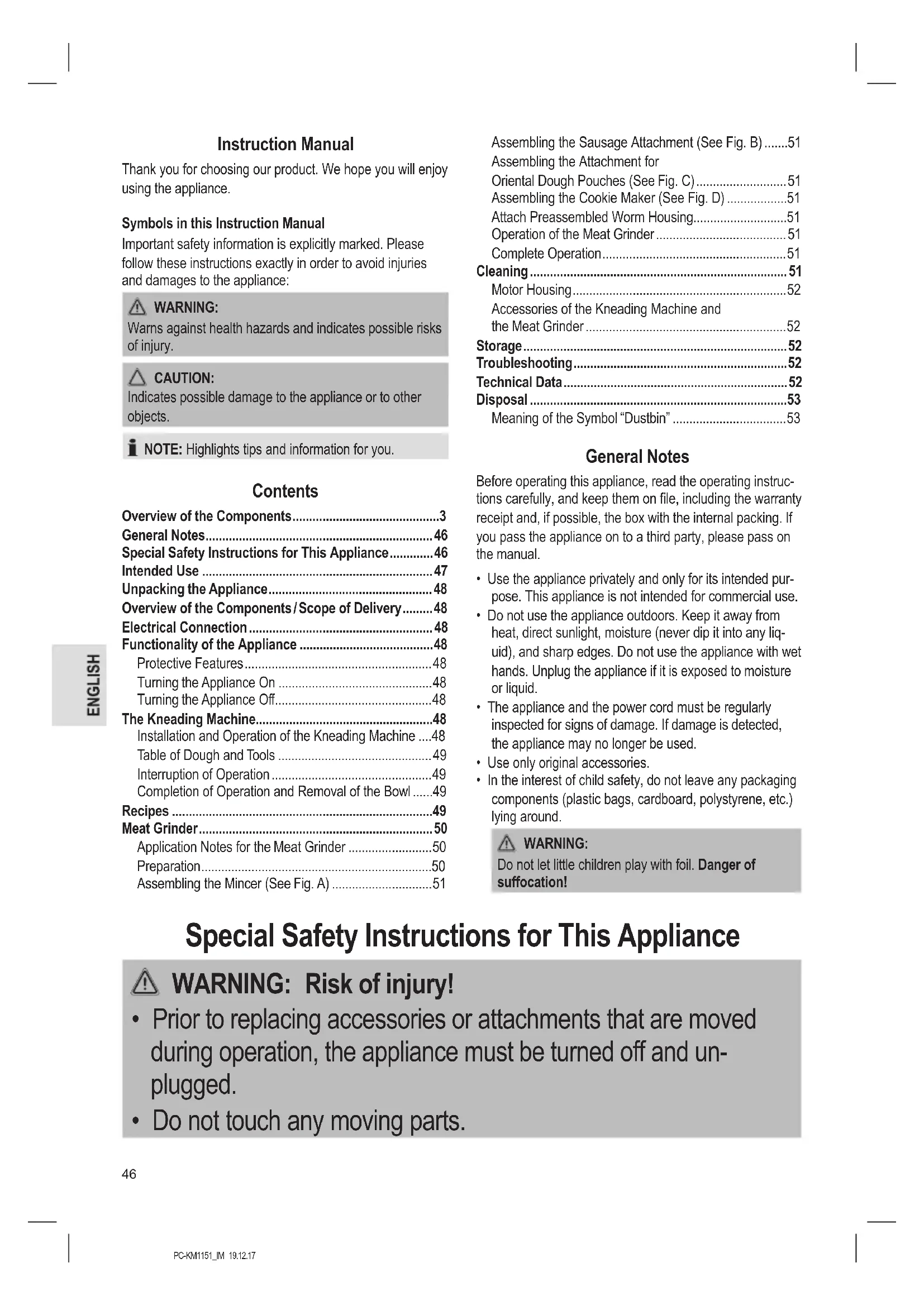 Special Safety Instructions for This Appliance. 46