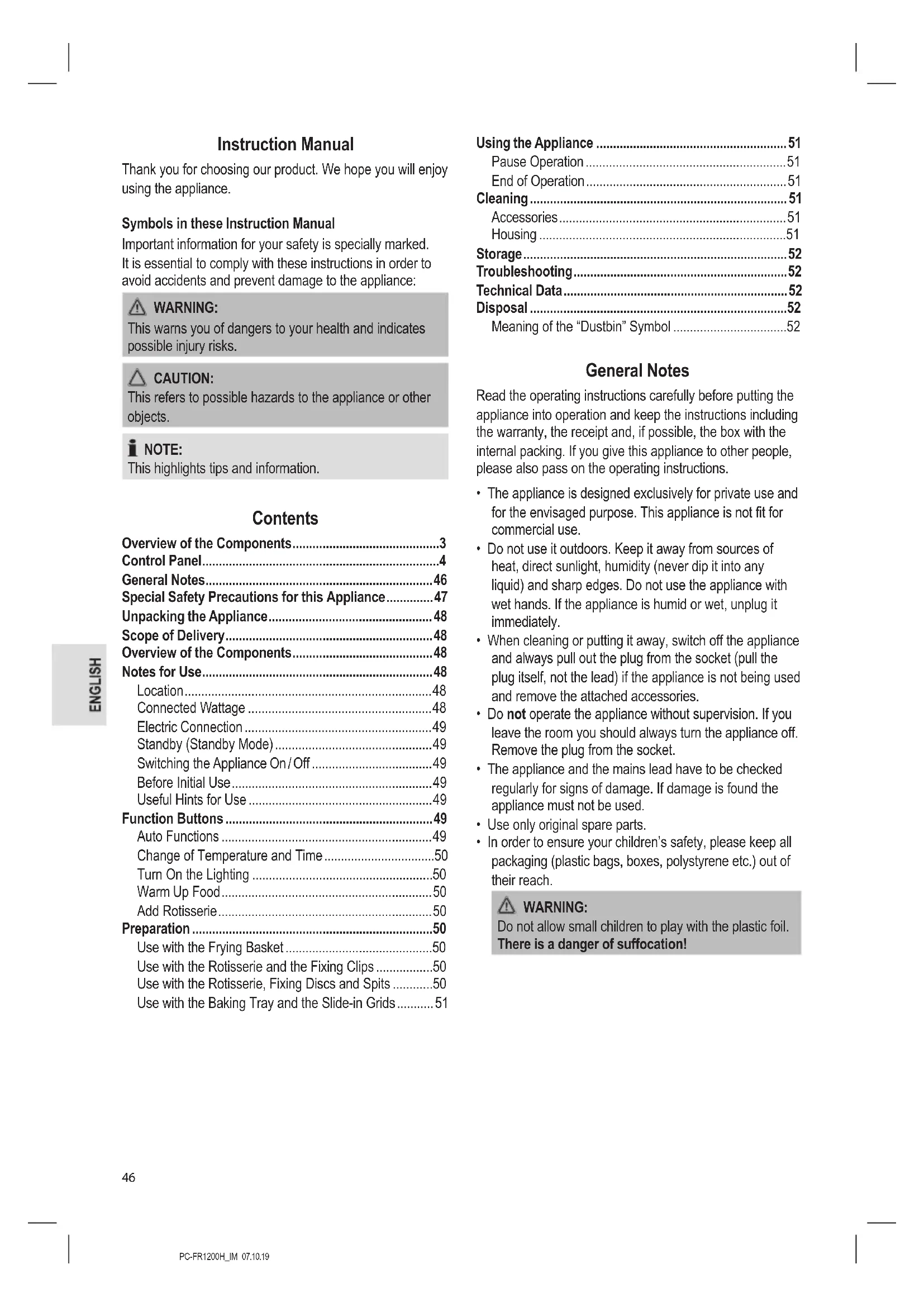 - Always store the appliance at a well ventilated and dry place outside the reach of children. Troubleshooting If a problem occurs, it is often only a small thing. Before you contact our service, please note the following information: Problem Possible Cause Remedy The appliance is not working. The appliance has no power supply. Check the socket with another appliance. Plug in the mains plug correctly. Check the main circuit breaker. The door is not closed properly. Close the door until it audibly snaps into place. The appliance is defective. Contact our service or a repair centre. The lighting in the interior does not light up anymore. The lighting is defect. The food is not cooked to the end. The basket is too full. Reduce the amount of food. Smaller quantities are cooked evenly. The temperature is set too low. Set a higher temperature. The cooking time is set too low. Set a longer period of time. The food is not crisp. Foods are used, which is only suitable for a conventional fryer. Use oven-ready food or sprinkle it with a little oil. Smoke comes out of the appliance. You are preparing very fatty foods. Fat splashes inside the appliance may cause the emission of fumes. Provide adequate ventilation. On the baking sheet / fat drip tray are still fat residues from previous use. Clean the baking sheet / fat drip tray after each use as described in the chapter “Cleaning”. Technical Data Model:..............................................................PC-FR 1200 H Power supply:.....................................220 - 240 V~, 50 / 60 Hz Power consumption: ...................................................1500 W Protection class: ..................................................................... Net weight: ....................................................... approx. 6.8 kg The right to make technical and design modications in the course of continuous product development remains reserved. This appliance has been tested according to all relevant current CE guidelines, such as electromagnetic compatibil- ity and low voltage directives, and has been constructed in accordance with the latest regulations. Disposal Meaning of the “Dustbin” Symbol Protect our environment: do not dispose of electrical equipment in the domestic waste. Please return any electrical equipment that you will no longer use to the collection points provided for their disposal. This helps avoid the potential effects of incorrect disposal on the environment and human health. This will contribute to the recycling and other forms of re-uti- lisation of electrical and electronic equipment. Information concerning where the equipment can be dis- posed of can be obtained from your local authority.PC-FR1200H_IM 07.10.19