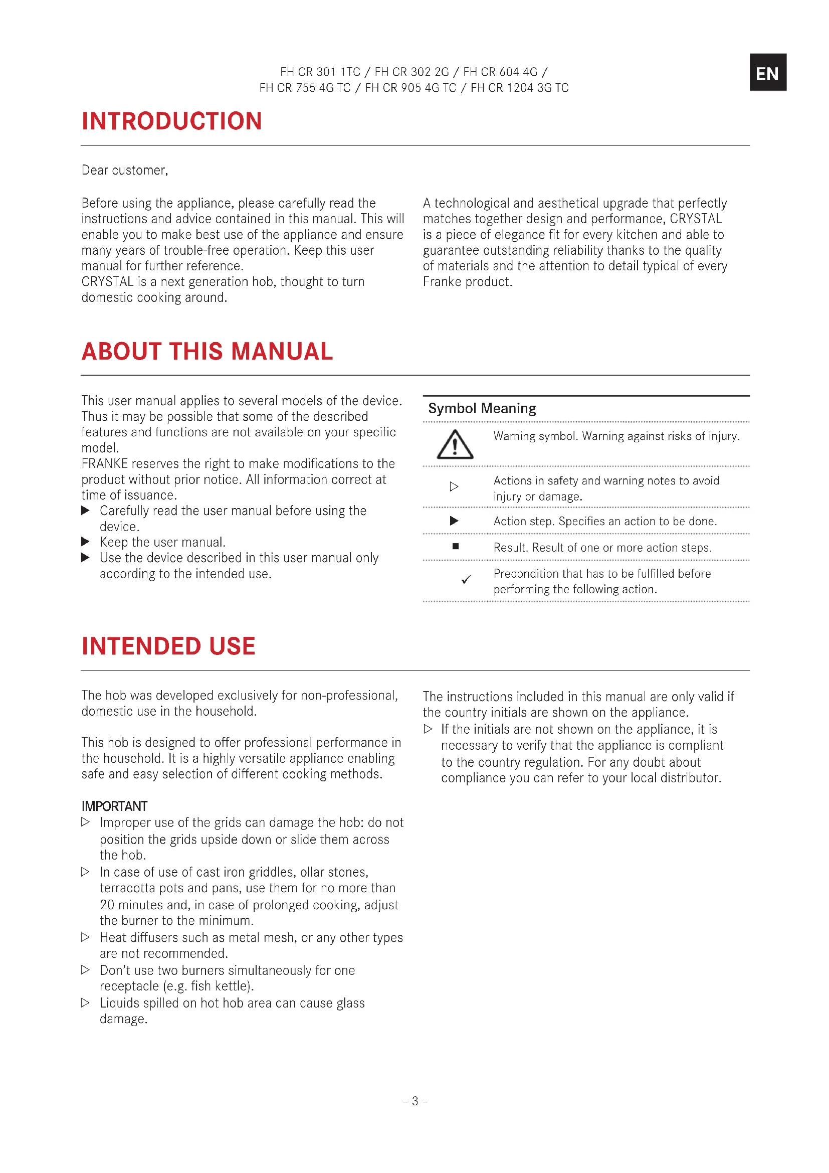 INTRODUCTION Dear customer, Before using the appliance, please carefully read the instructions and advice contained in this manual. This will enable you to make best use of the appliance and ensure many years of trouble-free operation. Keep this user manual for further reference. CRYSTAL is a next generation hob, thought to turn domestic cooking around. A technological and aesthetical upgrade that perfectly matches together design and performance, CRYSTAL is a piece of elegance fit for every kitchen and able to guarantee outstanding reliability thanks to the quality of materials and the attention to detail typical of every Franke product.