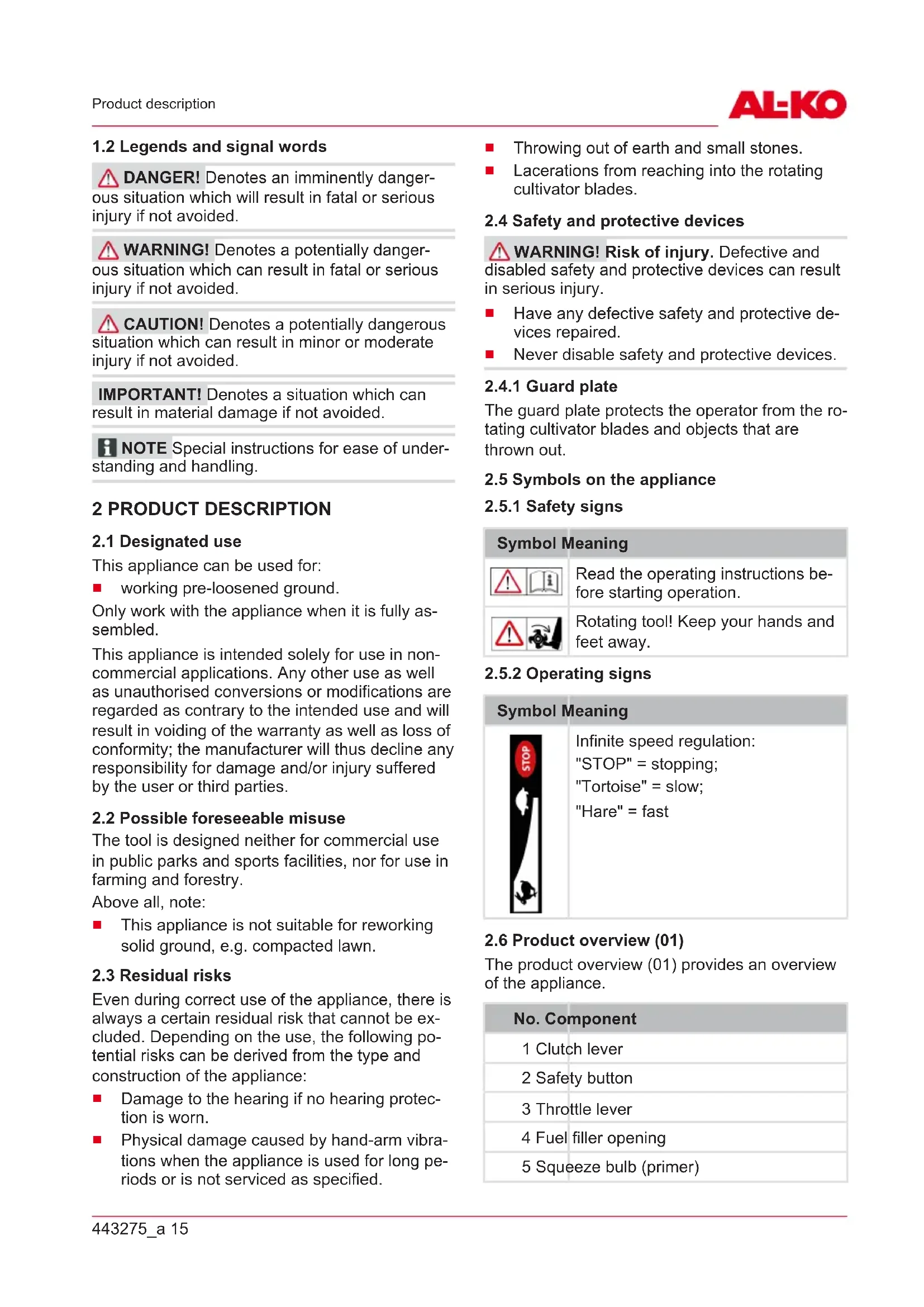 The product overview (01) provides an overview of the appliance. No. Component 1 Clutch lever 2 Safety button 3 Throttle lever 4 Fuel filler opening 5 Squeeze bulb (primer)GB 16 MH360 Safety instructions No. Component 6 Transport wheel 7 Cultivator blades 8 Oil filler cap 9 Guard plate 10 Depth skid 11 Starter cable 12 Handlebar 3 SAFETY INSTRUCTIONS DANGER! Danger of fatal injury and dan- ger of extremely severe injury! Lack of knowl- edge of the safety instructions and operating in- structions can lead to extremely serious and even fatal injury.