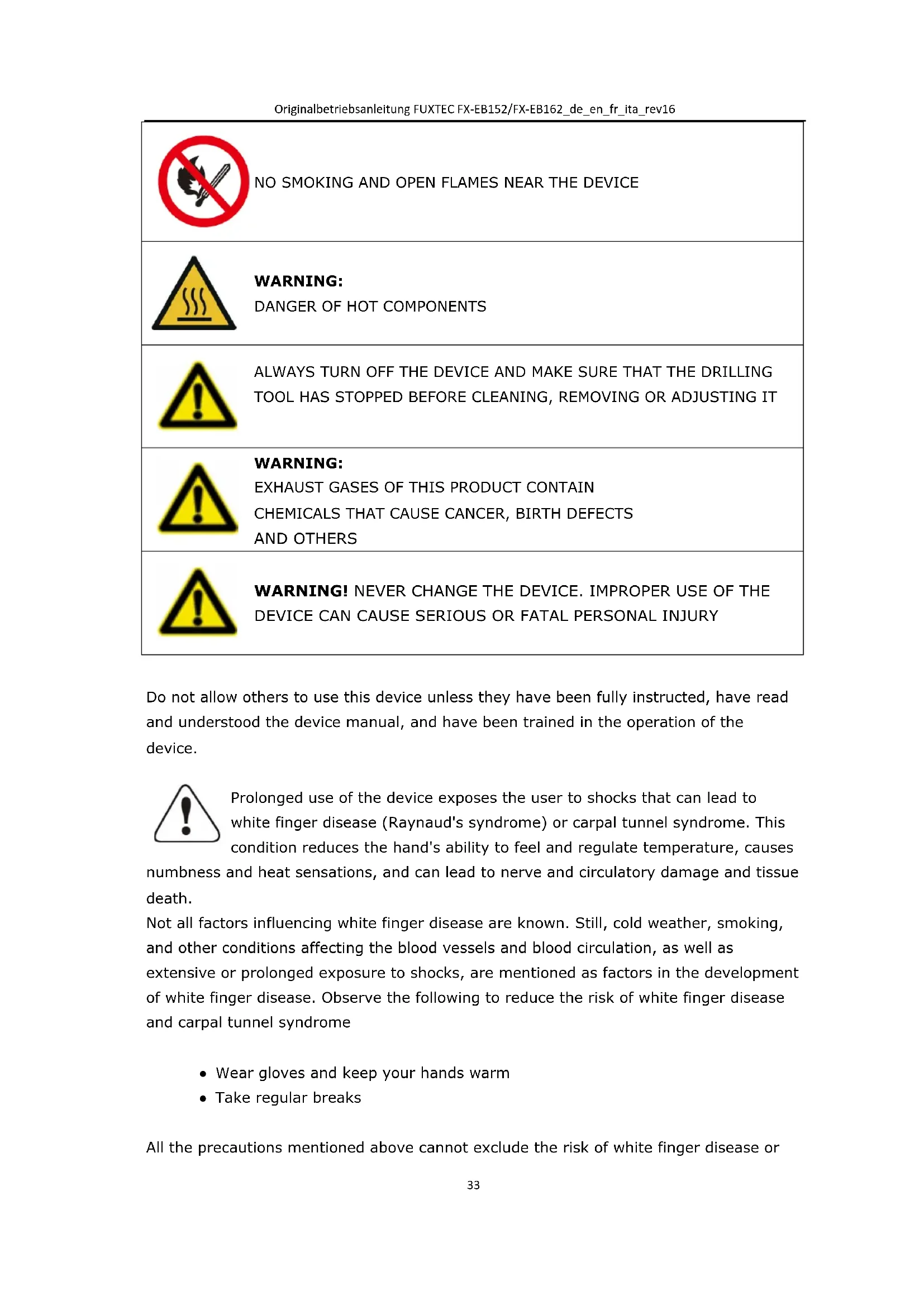 Do not allow others to use this device unless they have been fully instructed, have read and understood the device manual, and have been trained in the operation of the device. Prolonged use of the device exposes the user to shocks that can lead to white finger disease (Raynaud's syndrome) or carpal tunnel syndrome. This condition reduces the hand's ability to feel and regulate temperature, causes numbness and heat sensations, and can lead to nerve and circulatory damage and tissue death. Not all factors influencing white finger disease are known. Still, cold weather, smoking, and other conditions affecting the blood vessels and blood circulation, as well as extensive or prolonged exposure to shocks, are mentioned as factors in the development of white finger disease. Observe the following to reduce the risk of white finger disease and carpal tunnel syndrome ● Wear gloves and keep your hands warm ● Take regular breaks All the precautions mentioned above cannot exclude the risk of white finger disease orOriginalbetriebsanleitung FUXTEC FX-EB152/FX-EB162_de_en_fr_ita_rev16