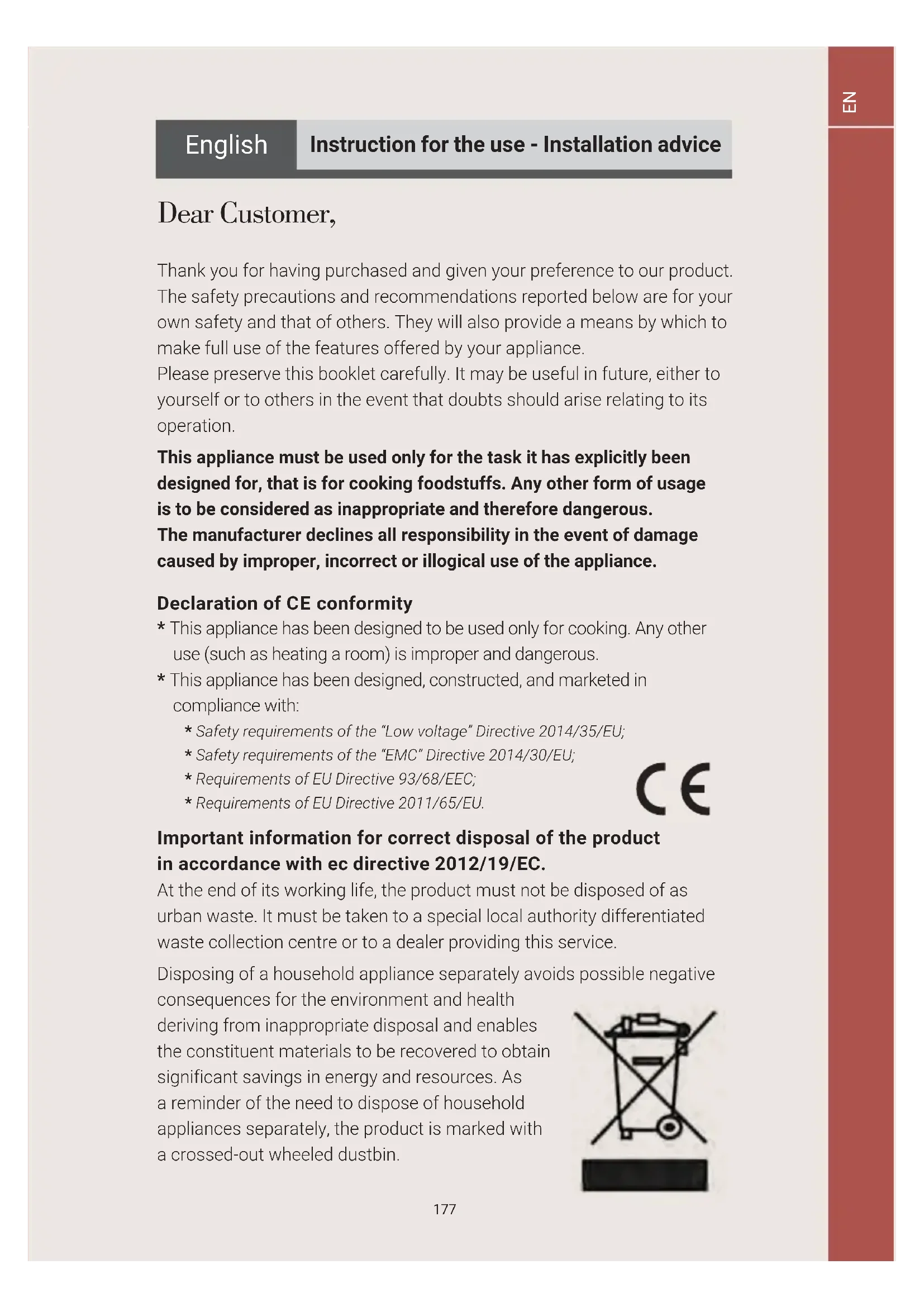 - This appliance has been designed and manufactured in compliance with the applicable standards for the household cooking products and it fulfills all the safety requirements shown in this manual, including those for surface temperatures.