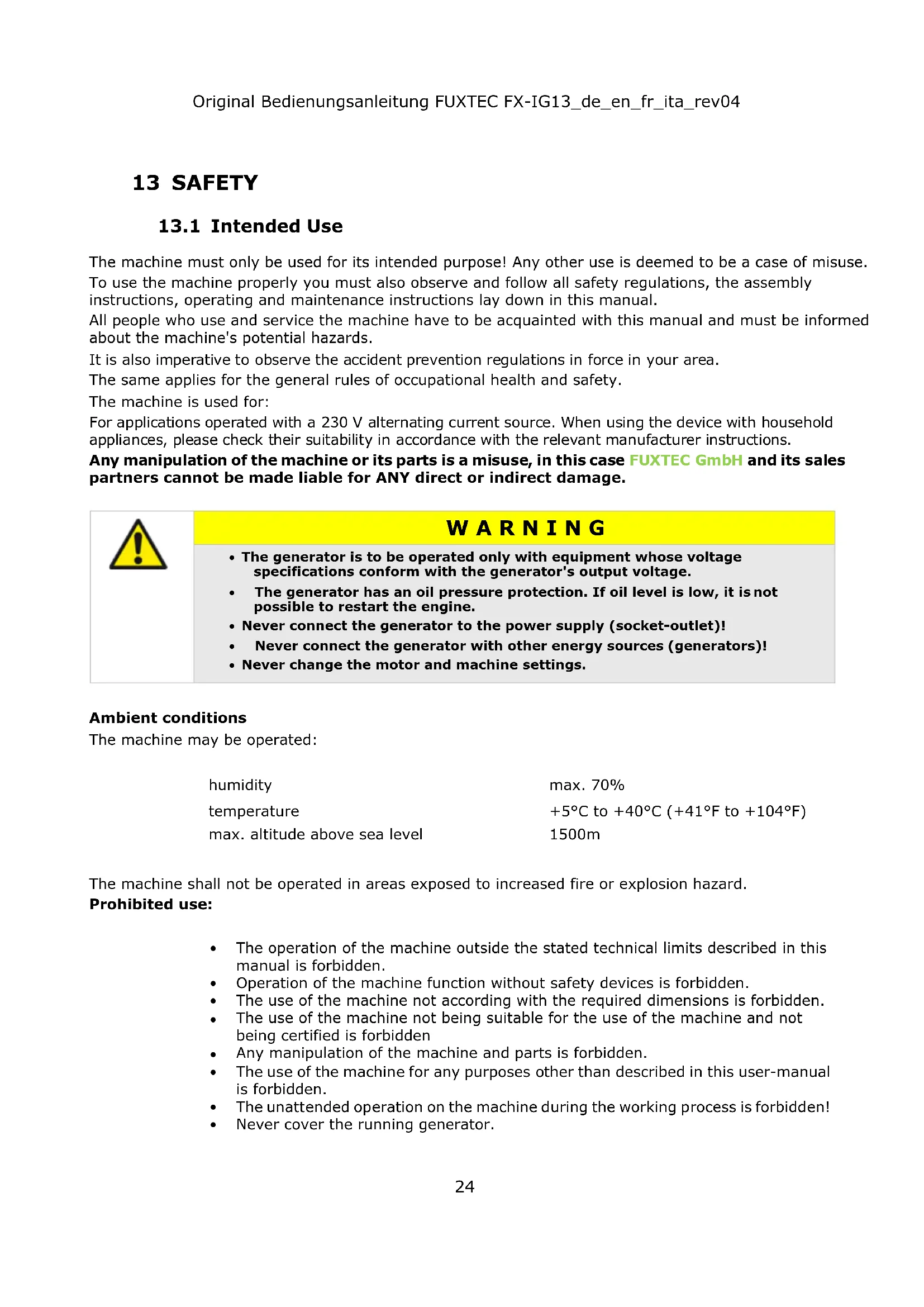 Always place the machine on a firm and flat surface! No turning, tilting or moving during the engine is running Always check oil and fuel level before starting Do not connect the appliance before the unit is running at full speed. Disconnect the appliance before turning the unit off. Connected devices must be in perfect condition. Keep the cable length to the consumer as short as possible.Original Bedienungsanleitung FUXTEC FX-IG13_de_en_fr_ita_rev04