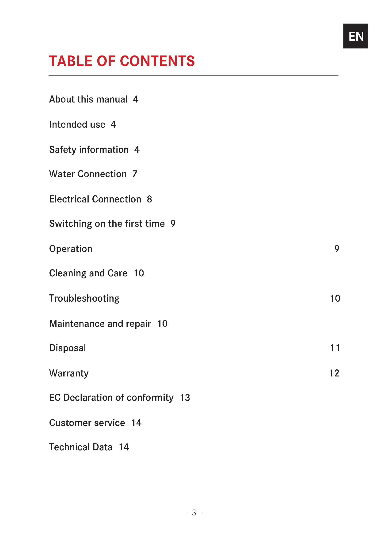 About this manual 4 Intended use 4 Safety information 4 Water Connection 7 Electrical Connection 8 Switching on the first time 9 Operation 9 Cleaning and Care 10 Troubleshooting 10 Maintenance and repair 10 Disposal 11 Warranty 12 EC Declaration of conformity 13 Customer service 14 Technical Data 14– 4 –