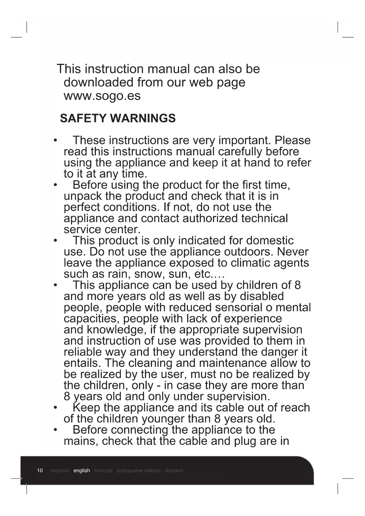 - Thisproductisonlyindicatedfordomestic use. Do not use the appliance outdoors. Never leave the appliance exposed to climatic agents such as rain, snow, sun, etc.…