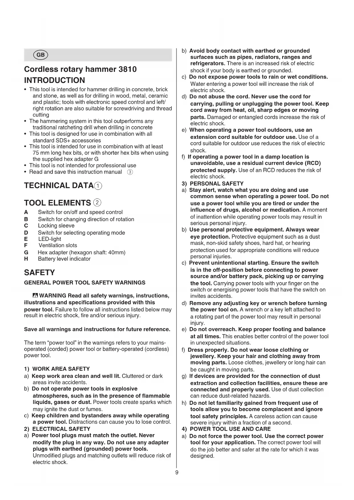 a) Recharge only with the charger specied by the manufacturer. A charger that is suitable for one type of battery pack may create a risk of re when used with another battery pack. b) Use power tools only with specically designated battery packs. Use of any other battery packs may create a risk of injury and re. c) When battery pack is not in use, keep it away from other metal objects like paper clips, coins, keys, nails, screws, or other small metal objects that can make a connection from one terminal to another. Shorting the battery terminals together may cause burns or a re. d) Under abusive conditions, liquid may be ejected from the battery; avoid contact. If contact accidentally occurs, ush with water. If liquid contacts eyes, additionally seek medical help. Liquid ejected from the battery may cause irritation or burns. e) Do not use a battery pack or tool that is damaged or modied. Damaged or modied batteries may exhibit unpredictable behaviour resulting in re, explosion or risk of injury. f) Do not expose a battery pack or tool to re or excessive temperature. Exposure to re or temperature above 130°C may cause explosion. g) Follow all charging instructions and do not charge the battery pack or tool outside the temperature range specied in the instructions. Charging improperly or at temperatures outside the specied range may damage the battery and increase the risk of re.11 - it takes a short time for the hammer mechanism to reach full impact power - best hammer drilling results can be obtained by only a slight pressure on the tool; drilling performance will not improve by applying more pressure on the tool