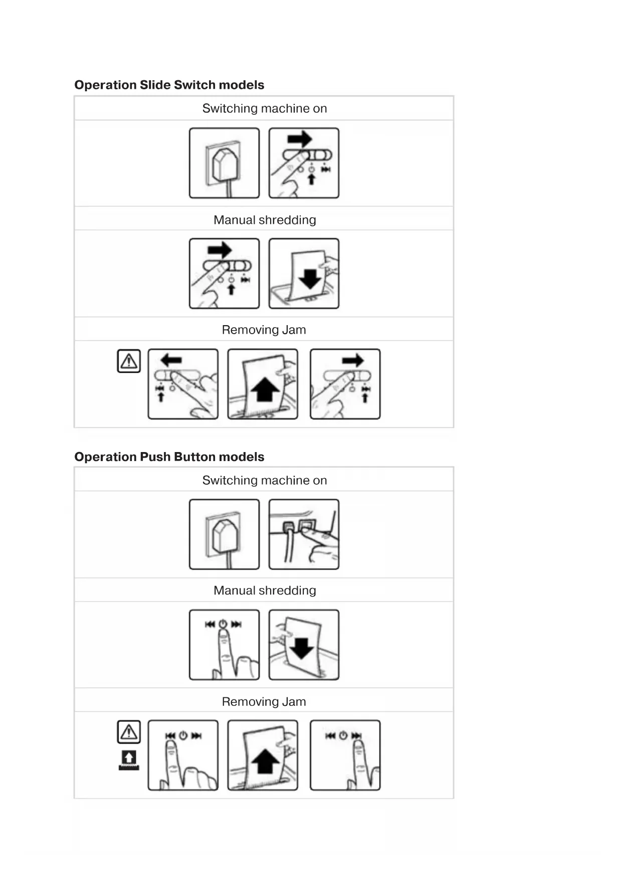 220-240V AC / 50-60HzOperation Slide Switch models Switching machine on Manual shredding Removing Jam Operation Push Button models Switching machine on Manual shredding Removing Jam4