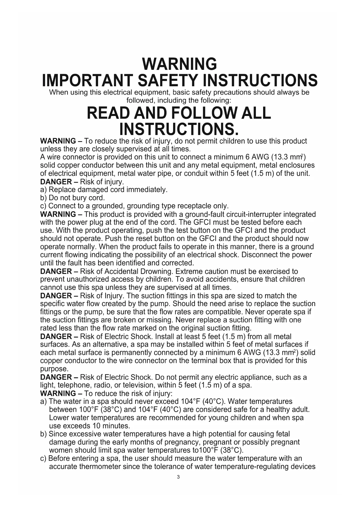 solid copper conductor between this unit and any metal equipment, metal enclosures of electrical equipment, metal water pipe, or conduit within 5 feet (1.5 m) of the unit. DANGER – Risk of injury. a) Replace damaged cord immediately. b) Do not bury cord. c) Connect to a grounded, grounding type receptacle only. WARNING – This product is provided with a ground-fault circuit-interrupter integrated with the power plug at the end of the cord. The GFCI must be tested before each use. With the product operating, push the test button on the GFCI and the product should not operate. Push the reset button on the GFCI and the product should now operate normally. When the product fails to operate in this manner, there is a ground current flowing indicating the possibility of an electrical shock. Disconnect the power until the fault has been identified and corrected. DANGER – Risk of Accidental Drowning. Extreme caution must be exercised to prevent unauthorized access by children. To avoid accidents, ensure that children cannot use this spa unless they are supervised at all times. DANGER – Risk of Injury. The suction fittings in this spa are sized to match the specific water flow created by the pump. Should the need arise to replace the suction fittings or the pump, be sure that the flow rates are compatible. Never operate spa if the suction fittings are broken or missing. Never replace a suction fitting with one rated less than the flow rate marked on the original suction fitting. DANGER – Risk of Electric Shock. Install at least 5 feet (1.5 m) from all metal surfaces. As an alternative, a spa may be installed within 5 feet of metal surfaces if each metal surface is permanently connected by a minimum 6 AWG (13.3 mm