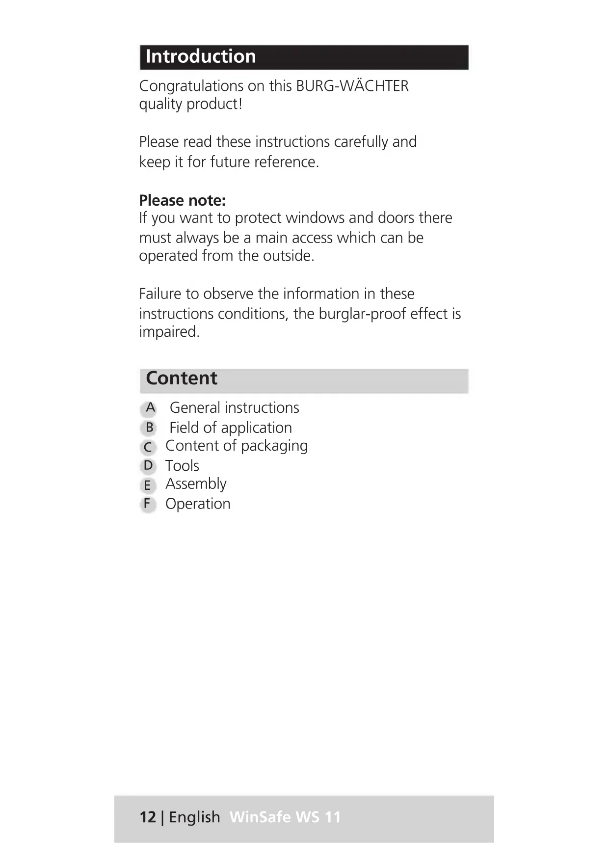 OperationWinSafe WS 11 English | 13 A. General instructions The window protection WS11 is approved by VdS 2536 and tested according to DIN 18104-1. According to DIN 18104-1 at least one additional protection should be mounted on each side for every 1 m window height. On the operating side (handle side) at least one additional protection must be lockable. The borehole depths and screw lengths must be matched according to local conditions. Do not pierce the windows / French doors, eventually work with a drill stopper. When drilling do not damage any moving parts, seals or glass panes. The mounting screws should be tightened by hand to avoid overtighting. For any possible injuries and / or damages caused by improper handling during assembly, the manufacturer accepts no liability. As an additional security measure, the use of a BURG-WÄCHTER mounting anchor MA 99 DUO is recommended.14 | English WinSafe WS 11 B. Field of application The WS 11 is mounted on the operating side (handle side) of the window or French door and is suitable for all standard, inward opening windows / French doors made of wood or aluminum.WinSafe WS 11 English | 15 C. Content of packaging