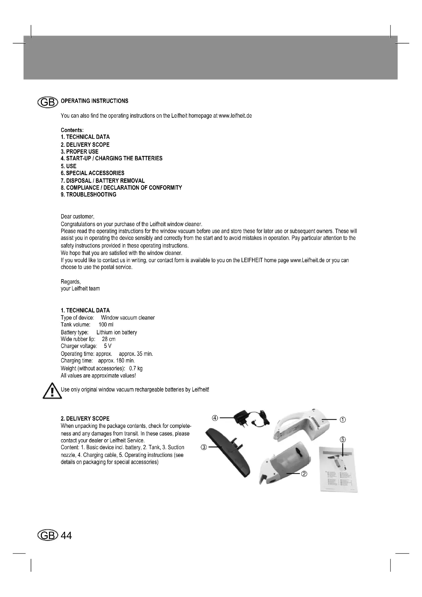 Type of device: Window vacuum cleaner Tank volume: 100 ml Battery type: Lithium ion battery Wide rubber lip: 28 cm Charger voltage: 5 V Operating time: approx. approx. 35 min. Charging time: approx. 180 min. Weight (without accessories): 0.7 kg Allvaluesareapproximatevalues! UseonlyoriginalwindowvacuumrechargeablebatteriesbyLeifheit! 2.DELIVERYSCOPE When unpacking the package contents, check for complete- ness and any damages from transit. In these cases, please contact your dealer or Leifheit Service. Content: 1. Basic device incl. battery, 2. Tank, 3. Suction nozzle, 4. Charging cable, 5. Operating instructions (see details on packaging for special accessories)