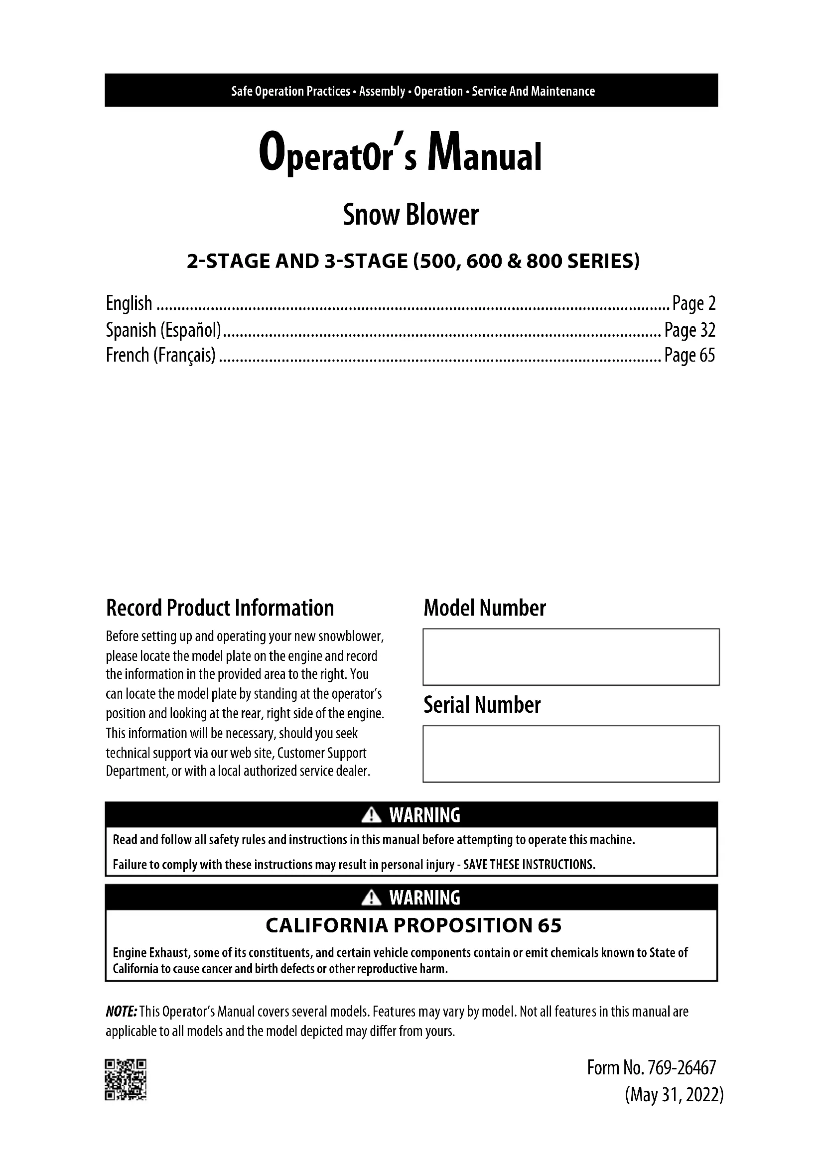 Safe Operation Practices • Assembly • Operation • Service And Maintenance Form No. 769-26467 (May 31, 2022) OperatOr’s Manual Snow Blower 2-STAGE AND 3-STAGE (500, 600 & 800 SERIES) English ...........................................................................................................................Page 2 Spanish (Español) .........................................................................................................Page 32 French (Français) .......................................................................................................... Page 65 Model Number Serial Number Record Product Information Before setting up and operating your new snowblower, please locate the model plate on the engine and record the information in the provided area to the right. You can locate the model plate by standing at the operator’s position and looking at the rear, right side of the engine. This information will be necessary, should you seek technical support via our web site, Customer Support Department, or with a local authorized service dealer. WARNING Read and follow all safety rules and instructions in this manual before attempting to operate this machine. Failure to comply with these instructions may result in personal injury - SAVE THESE INSTRUCTIONS. WARNING CALIFORNIA PROPOSITION 65 Engine Exhaust, some of its constituents, and certain vehicle components contain or emit chemicals known to State of California to cause cancer and birth defects or other reproductive harm. NOTE: This Operator’s Manual covers several models. Features may vary by model. Not all features in this manual are applicable to all models and the model depicted may differ from yours.2