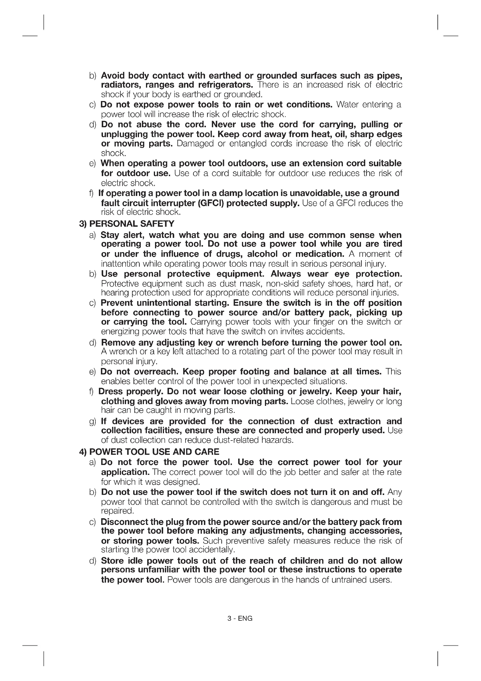 a) Power tool plugs must match the outlet. Never modify the plug in any way. Do not use any adapter plugs with earthed (grounded) power tools. Unmodified plugs and matching outlets will reduce risk of electric shock.3 - ENG b) Avoid body contact with earthed or grounded surfaces such as pipes, radiators, ranges and refrigerators. There is an increased risk of electric shock if your body is earthed or grounded. c) Do not expose power tools to rain or wet conditions. Water entering a power tool will increase the risk of electric shock. d) Do not abuse the cord. Never use the cord for carrying, pulling or unplugging the power tool. Keep cord away from heat, oil, sharp edges or moving parts. Damaged or entangled cords increase the risk of electric shock. e) When operating a power tool outdoors, use an extension cord suitable for outdoor use. Use of a cord suitable for outdoor use reduces the risk of electric shock. f) If operating a power tool in a damp location is unavoidable, use a ground fault circuit interrupter (GFCI) protected supply. Use of a GFCI reduces the risk of electric shock.