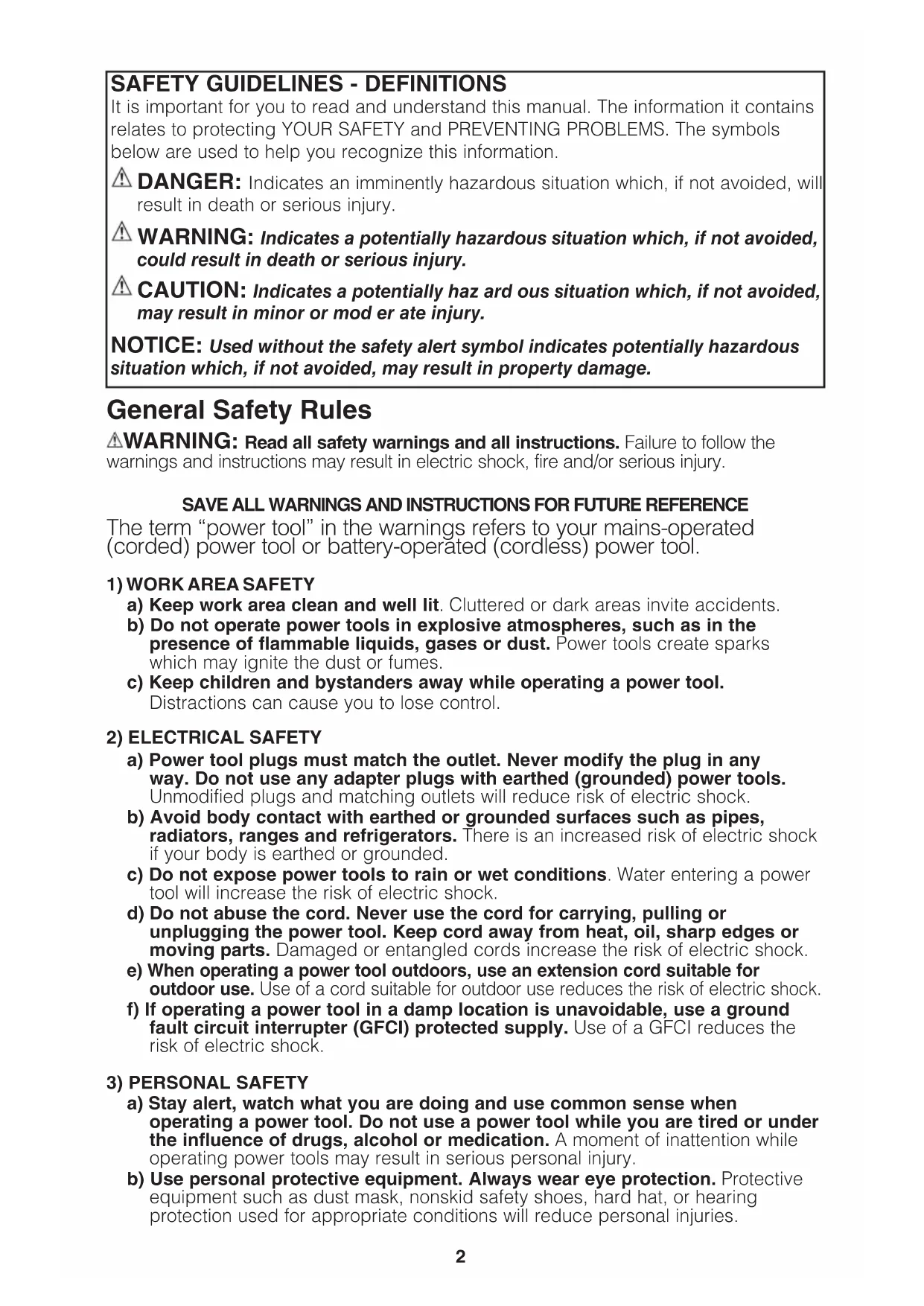 a) Keep work area clean and well lit. Cluttered or dark areas invite accidents. b) Do not operate power tools in explosive atmospheres, such as in the presence of ammable liquids, gases or dust. Power tools create sparks which may ignite the dust or fumes. c) Keep children and bystanders away while operating a power tool. Distractions can cause you to lose control.