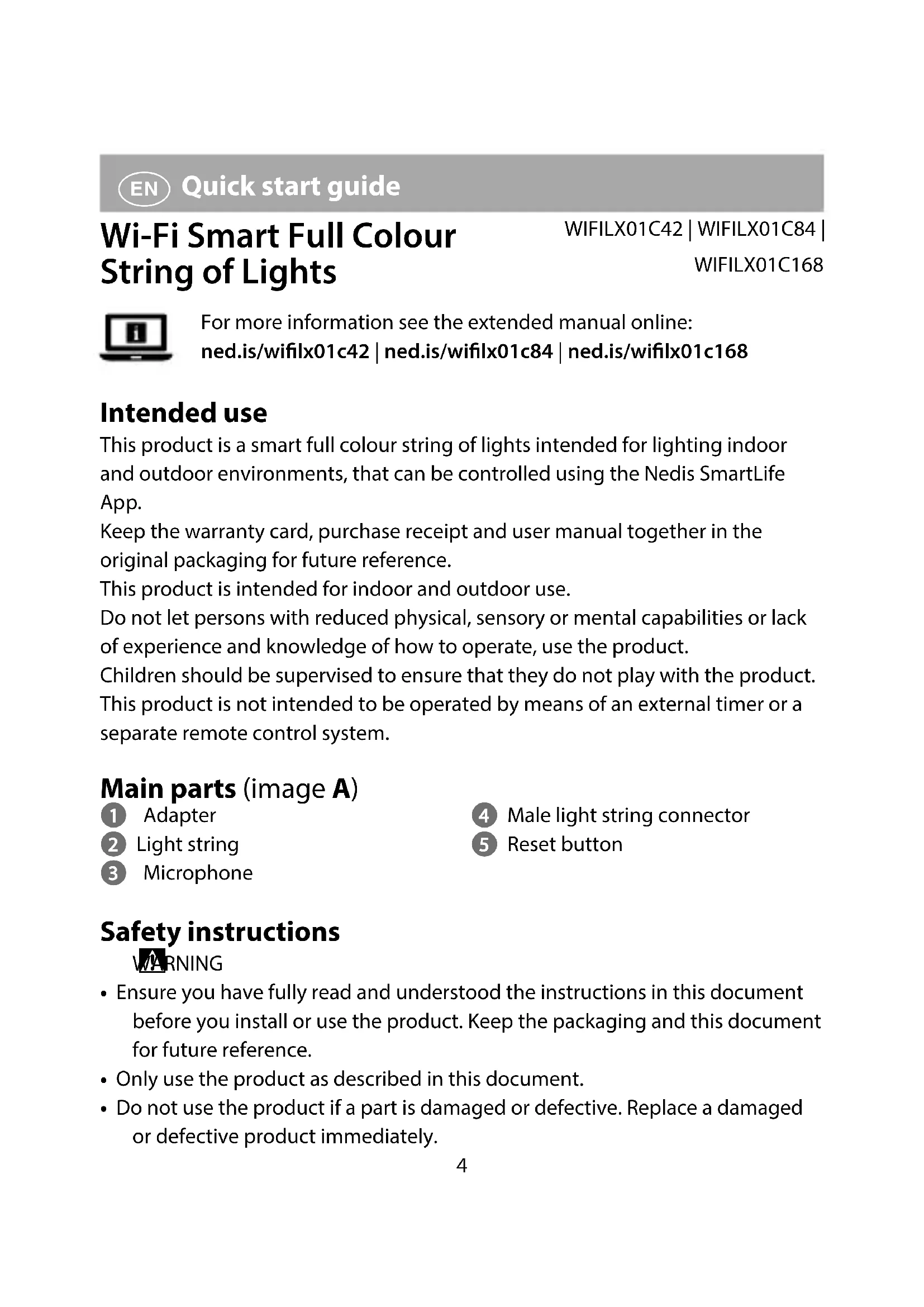 Quick start guide Wi-Fi Smart Full Colour String of Lights WIFILX01C42 | WIFILX01C84 | WIFILX01C168For more information see the extended manual online: ned.is/wilx01c42 | ned.is/wilx01c84 | ned.is/wilx01c168 Intended use This product is a smart full colour string of lights intended for lighting indoor and outdoor environments, that can be controlled using the Nedis SmartLife App. Keep the warranty card, purchase receipt and user manual together in the original packaging for future reference.This product is intended for indoor and outdoor use.Do not let persons with reduced physical, sensory or mental capabilities or lack of experience and knowledge of how to operate, use the product.Children should be supervised to ensure that they do not play with the product.This product is not intended to be operated by means of an external timer or a separate remote control system. Main parts (image A) 1 Adapter 2 Light string 3 Microphone 4 Male light string connector 5 Reset button Safety instructions