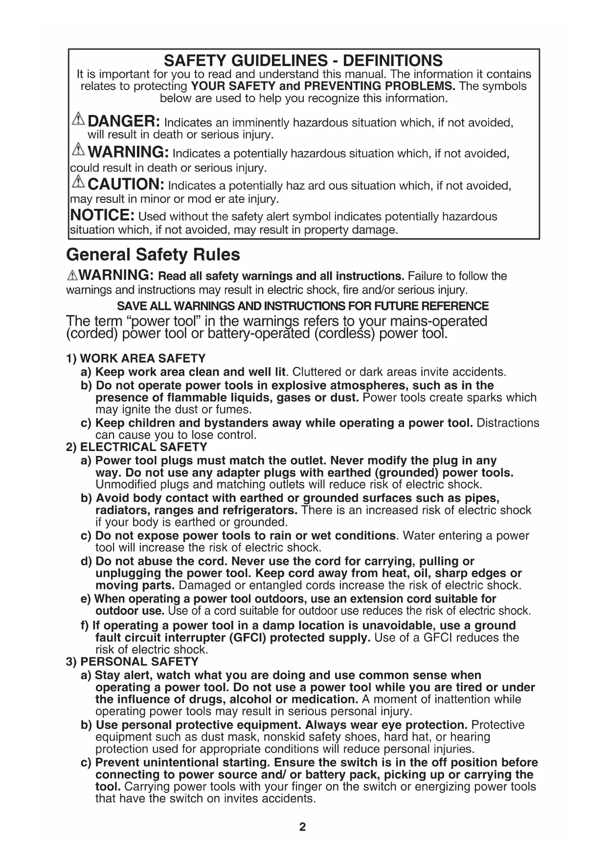 warnings and instructions may result in electric shock, fire and/or serious injury. SAVE ALL WARNINGS AND INSTRUCTIONS FOR FUTURE REFERENCE The term “power tool” in the warnings refers to your mains-operated (corded) power tool or battery-operated (cordless) power tool.