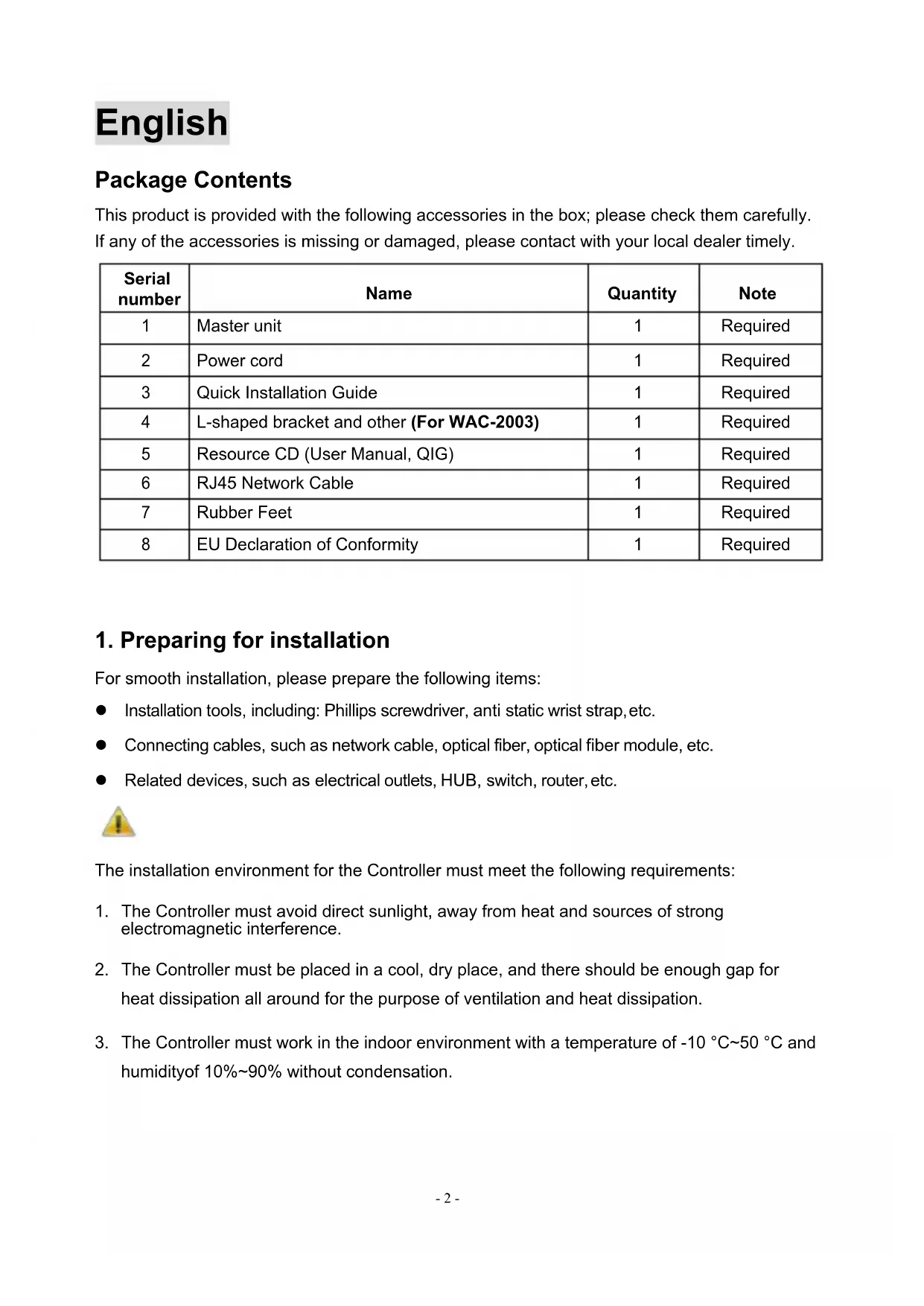 For smooth installation, please prepare the following items: l Installation tools, including: Phillips screwdriver, anti static wrist strap, etc. l Connecting cables, such as network cable, optical fiber, optical fiber module, etc. l Related devices, such as electrical outlets, HUB, switch, router, etc. The installation environment for the Controller must meet the following requirements:
