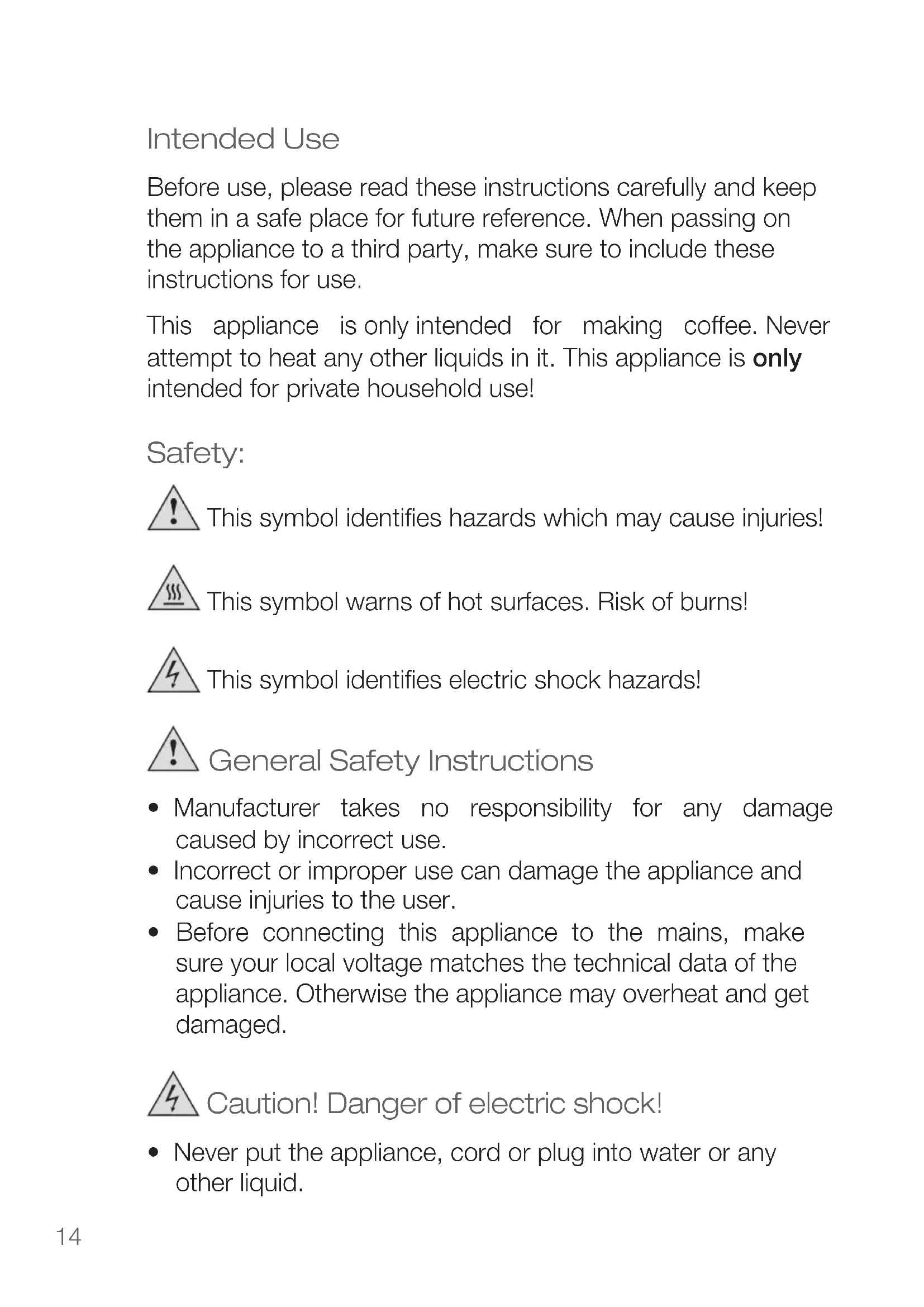 - Before connecting this appliance to the mains, make sure your local voltage matches the technical data of the appliance. Otherwise the appliance may overheat and get damaged. Caution! Danger of electric shock!