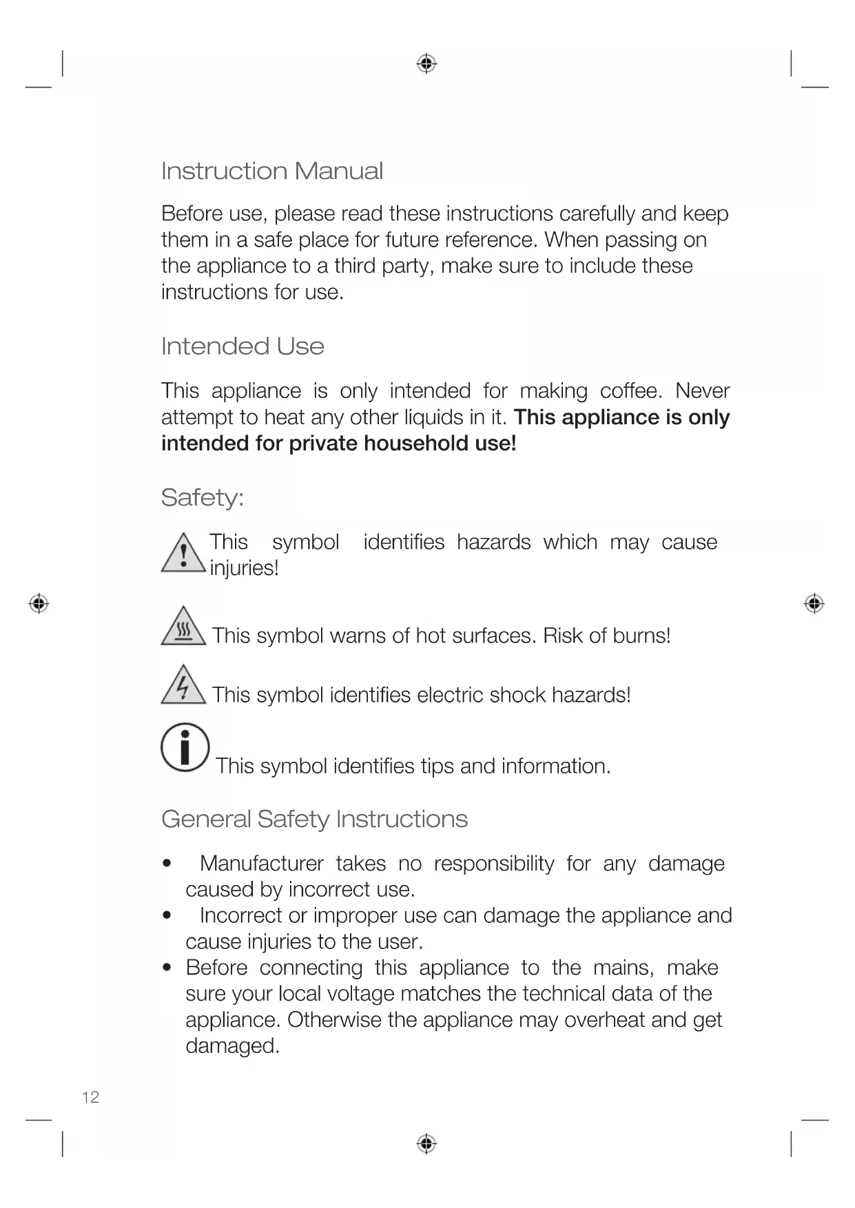 Before cleaning, always switch off the appliance and disconnect it from the mains. Let it completely cool down. Never immerse the appliance in water. Danger! Electric Shock! Clean the body of the appliance with a moistened soft cloth. Do not use any aggressive cleaning agents and/or other hard objects to clean the appliance. All detachable parts can be cleaned in warm water using some dishwashing detergent. Rinse them afterwards and dry them thoroughly. DESCALING Depending on the water quality and usage, calcification can occur. Therefore, to keep your coffee maker operating efficiently, you should descale it on a regular basis. Never use any sharp, pointed or metal objects to remove limescale built up in the appliance. To remove limescale, use a common gentle descaler, which is suitable for your appliance. Follow the manufacturer’s instructions. After descaling, always rinse your appliance as described under Before First Use. Note: Descaler mixtures should not be poured down enamel coated sinks. STORAGE Keep the appliance away from children and store it in a clean and dry place. Disposal Instructions Waste electrical devices marked with this sign must not be disposed of with your household waste, but are to be collected separately. Therefore, please return this device at the end of its life cycle to special collection points for disposal or your local dealer. Your Retro Coffee Maker 10665 / 10666 is packed in a retail box. Such boxes are recyclable waste, i.e. they are reusable or recyclable. TECHNICAL DATA Voltage: 220 - 240 V ~ 50 - 60 Hz Power: 900 W Protection class: I Technical data subject to change!Instruction Manual ENGLISH