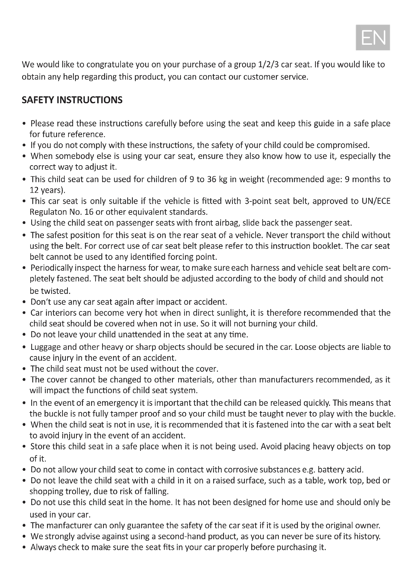 - The manfacturer can only guarantee the safety of the car seat if it is used by the original owner.