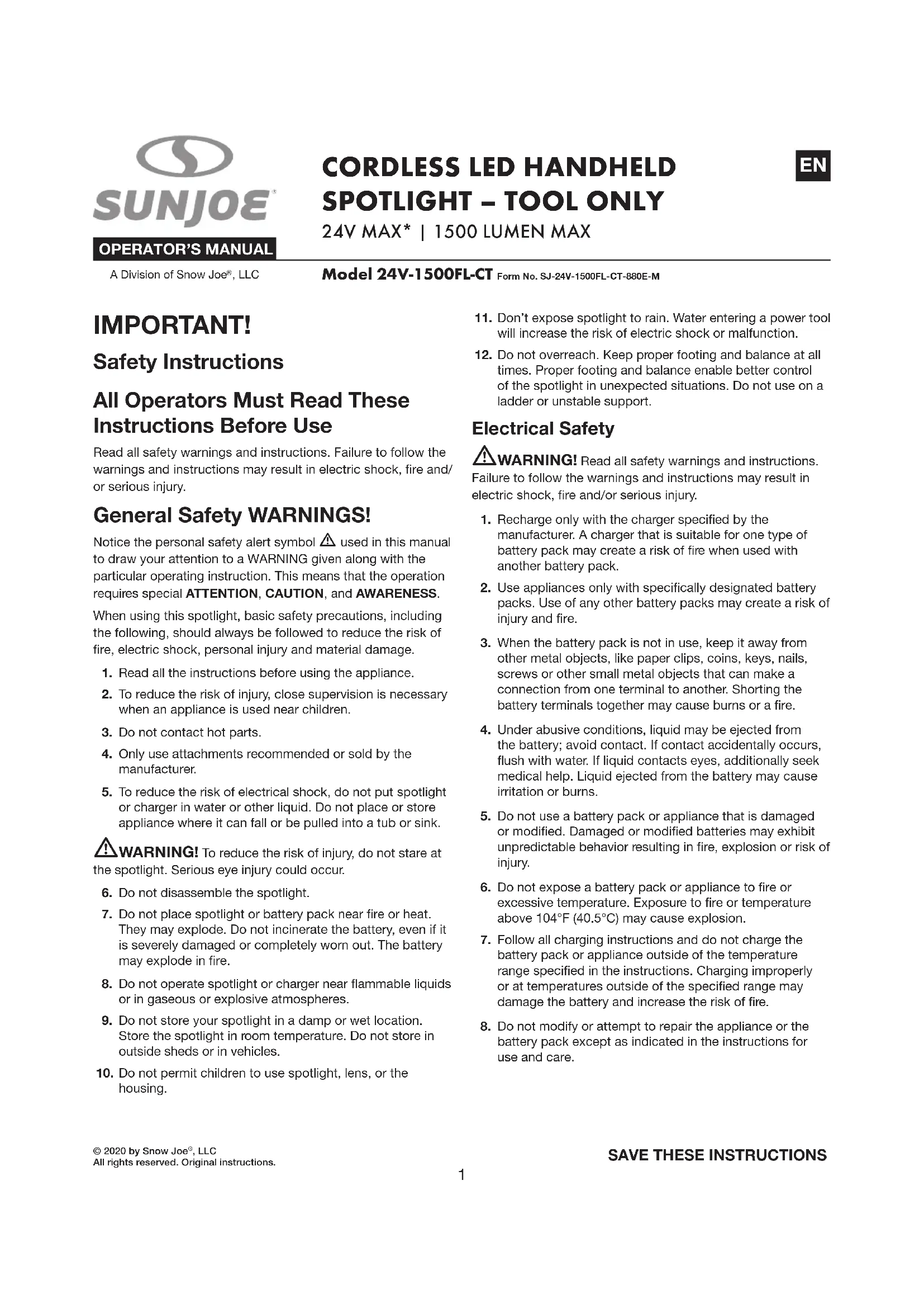 USER MANUAL 24V1500FLCT Sun Joe