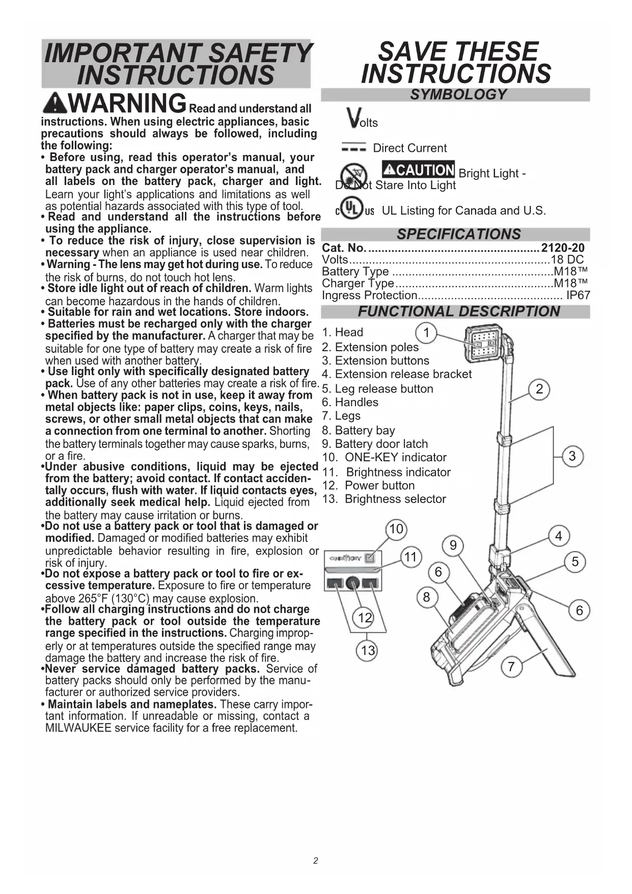 - Maintain labels and nameplates. These carry impor- tant information. If unreadable or missing, contact a MILWAUKEE service facility for a free replacement. SAVE THESE INSTRUCTIONS SYMBOLOGY Volts Direct Current CAUTION Bright Light - Do Not Stare Into Light