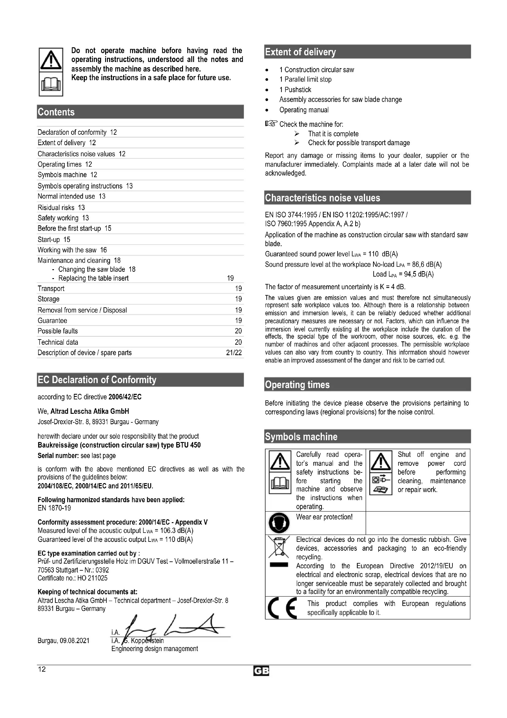 Download the instructions for your Saw in PDF format for free! Find your manual BTU 450 - ATIKA and take your electronic device back in hand. On this page are published all the documents necessary for the use of your device. BTU 450 by ATIKA.