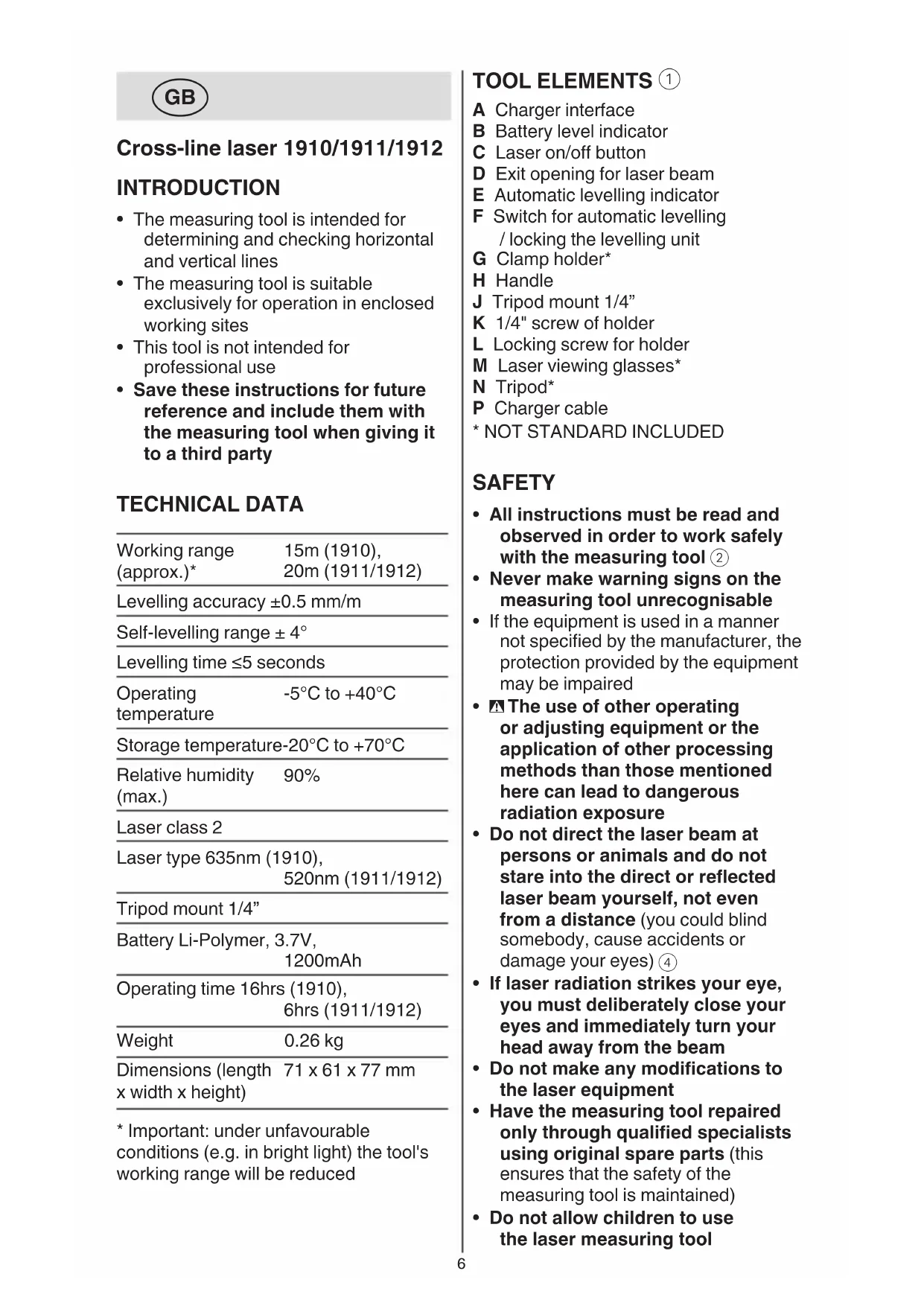 - Save these instructions for future reference and include them with the measuring tool when giving it to a third party TECHNICAL DATA Working range (approx.)* 15m (1910), 20m (1911/1912) Levelling accuracy ±0.5 mm/m Self-levelling range ± 4° Levelling time ≤5 seconds Operating temperature -5°C to +40°C Storage temperature-20°C to +70°C Relative humidity (max.) 90% Laser class 2 Laser type 635nm (1910), 520nm (1911/1912) Tripod mount 1/4” Battery Li-Polymer, 3.7V, 1200mAh Operating time 16hrs (1910), 6hrs (1911/1912) Weight 0.26 kg Dimensions (length x width x height) 71 x 61 x 77 mm