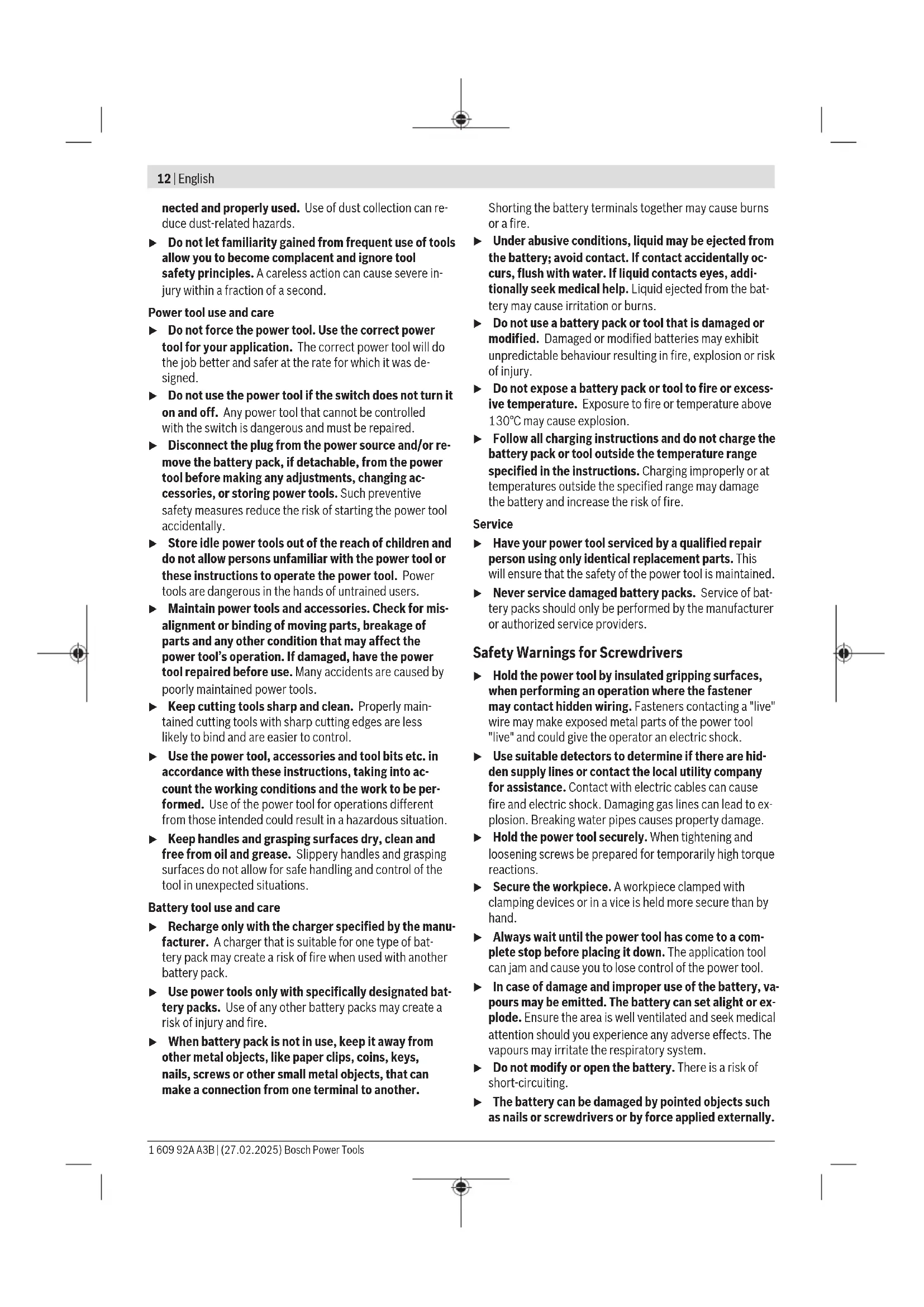 äußeren Abmessung größer als 25cm sind, im Einzel- handelsgeschäft oder in unmittelbarer Nähe hierzu un- entgeltlich zurückzunehmen; die Rücknahme darf nicht an den Kauf eines Elektro- oder Elektronikgerätes ge- 1 609 92A A3B | (27.02.2025) Bosch Power ToolsEnglish | 11 knüpft werden und ist auf drei Altgeräte pro Geräteart beschränkt. Der Vertreiber hat beim Abschluss des Kaufvertrags für das neue Elektro- oder Elektronikgerät den Endnutzer über die Möglichkeit zur unentgeltlichen Rückgabe bzw. Abholung des Altgeräts zu informieren und den Endnutzer nach seiner Absicht zu befragen, ob bei der Auslieferung des neuen Ge- räts ein Altgerät zurückgegeben wird. Dies gilt auch bei Vertrieb unter Verwendung von Fernkom- munikationsmitteln, wenn die Lager- und Versandflächen für Elektro- und Elektronikgeräte mindestens 400m² betragen oder die gesamten Lager- und Versandflächen mindestens 800m² betragen, wobei die unentgeltliche Abholung auf Elektro- und Elektronikgeräte der Kategorien 1 (Wärmeüber- träger), 2 (Bildschirmgeräte) und 4 (Großgeräte mit mindes- tens einer äußeren Abmessung über 50cm) beschränkt ist. Für alle übrigen Elektro- und Elektronikgeräte muss der Ver- treiber geeignete Rückgabemöglichkeiten in zumutbarer Ent- fernung zum jeweiligen Endnutzer gewährleisten; das gilt auch für Altgeräte, die in keiner äußeren Abmessung größer als 25cm sind, die der Endnutzer zurückgeben will, ohne ein neues Gerät zu kaufen. Akkus/Batterien: Li-Ion: Bitte beachten Sie die Hinweise im Abschnitt Transport (sie- he „Transport“, Seite10). English Safety Instructions General Power Tool Safety Warnings WARNING Read all safety warnings, instruc- tions, illustrations and specifica- tions provided with this power tool. Failure to follow all in- structions listed below may result in electric shock, fire and/ or serious injury. Save all warnings and instructions for future reference. The term "power tool" in the warnings refers to your mains- operated (corded) power tool or battery-operated (cord- less) power tool. Work area safety u Keep work area clean and well lit. Cluttered or dark areas invite accidents. u Do not operate power tools in explosive atmospheres, such as in the presence of flammable liquids, gases or dust. Power tools create sparks which may ignite the dust or fumes. u Keep children and bystanders away while operating a power tool. Distractions can cause you to lose control. Electrical safety u Power tool plugs must match the outlet. Never modify the plug in any way. Do not use any adapter plugs with earthed (grounded) power tools. Unmodified plugs and matching outlets will reduce risk of electric shock. u Avoid body contact with earthed or grounded sur- faces, such as pipes, radiators, ranges and refrigerat- ors. There is an increased risk of electric shock if your body is earthed or grounded. u Do not expose power tools to rain or wet conditions. Water entering a power tool will increase the risk of elec- tric shock. u Do not abuse the cord. Never use the cord for carry- ing, pulling or unplugging the power tool. Keep cord away from heat, oil, sharp edges or moving parts. Damaged or entangled cords increase the risk of electric shock. u When operating a power tool outdoors, use an exten- sion cord suitable for outdoor use. Use of a cord suit- able for outdoor use reduces the risk of electric shock. u If operating a power tool in a damp location is un- avoidable, use a residual current device (RCD) protec- ted supply. Use of an RCD reduces the risk of electric shock. Personal safety u Stay alert, watch what you are doing and use common sense when operating a power tool. Do not use a power tool while you are tired or under the influence of drugs, alcohol or medication. A moment of inatten- tion while operating power tools may result in serious per- sonal injury. u Use personal protective equipment. Always wear eye protection. Protective equipment such as a dust mask, non-skid safety shoes, hard hat or hearing protection used for appropriate conditions will reduce personal in- juries. u Prevent unintentional starting. Ensure the switch is in the off-position before connecting to power source and/or battery pack, picking up or carrying the tool. Carrying power tools with your finger on the switch or en- ergising power tools that have the switch on invites acci- dents. u Remove any adjusting key or wrench before turning the power tool on. A wrench or a key left attached to a rotating part of the power tool may result in personal in- jury. u Do not overreach. Keep proper footing and balance at all times. This enables better control of the power tool in unexpected situations. u Dress properly. Do not wear loose clothing or jew- ellery. Keep your hair and clothing away from moving parts. Loose clothes, jewellery or long hair can be caught in moving parts. u If devices are provided for the connection of dust ex- traction and collection facilities, ensure these are con- Bosch Power Tools 1 609 92A A3B | (27.02.2025)12 | English nected and properly used. Use of dust collection can re- duce dust-related hazards. u Do not let familiarity gained from frequent use of tools allow you to become complacent and ignore tool safety principles. A careless action can cause severe in- jury within a fraction of a second. Power tool use and care u Do not force the power tool. Use the correct power tool for your application. The correct power tool will do the job better and safer at the rate for which it was de- signed. u Do not use the power tool if the switch does not turn it on and off. Any power tool that cannot be controlled with the switch is dangerous and must be repaired. u Disconnect the plug from the power source and/or re- move the battery pack, if detachable, from the power tool before making any adjustments, changing ac- cessories, or storing power tools. Such preventive safety measures reduce the risk of starting the power tool accidentally. u