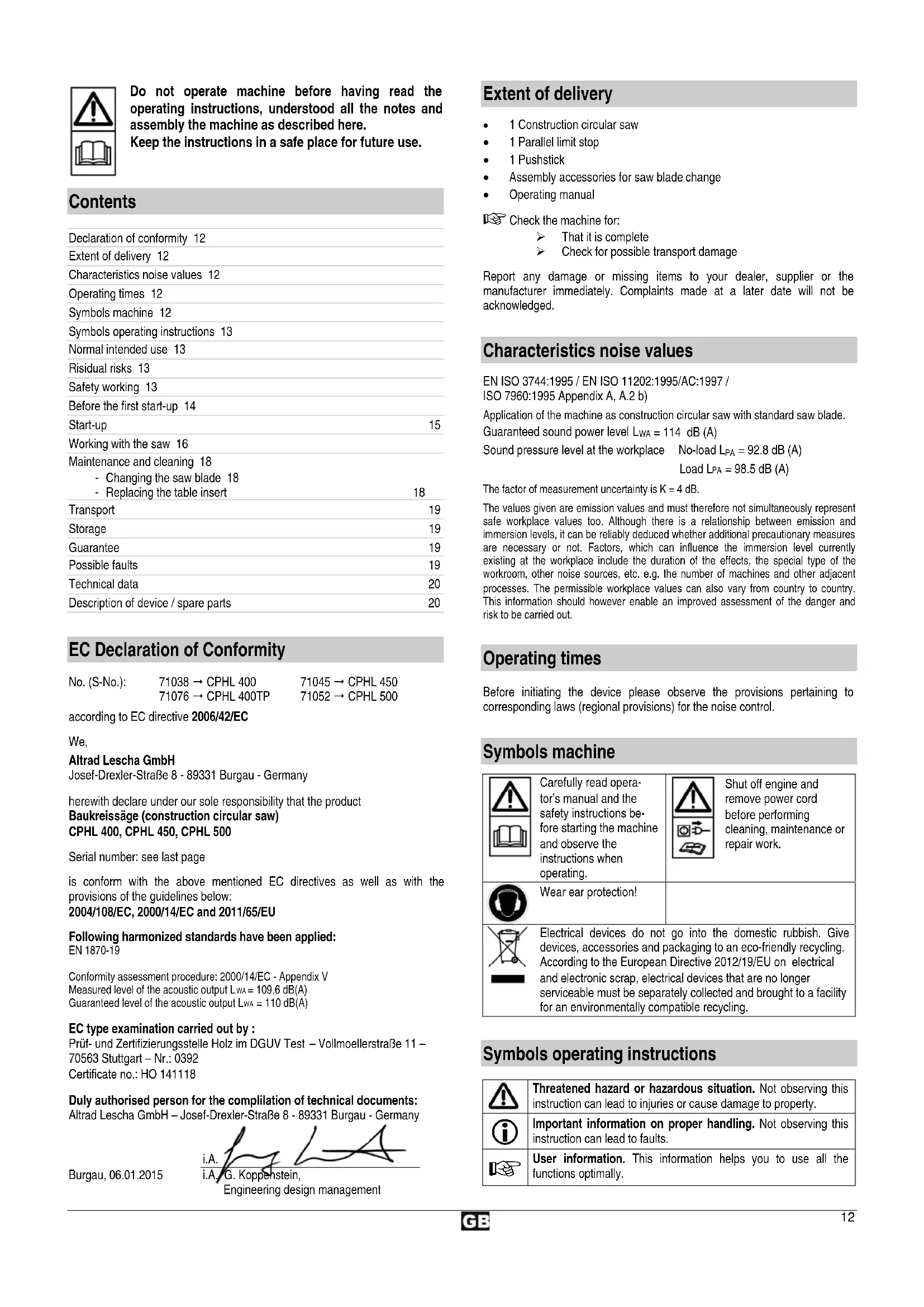 Serial number: see last page is conform with the above mentioned EC directives as well as with the provisions of the guidelines below: 2004/108/EC, 2000/14/EC and 2011/65/EU Following harmonized standards have been applied: EN 1870-19 Conformity assessment procedure: 2000/14/EC - Appendix V Measured level of the acoustic output L = 109,6 dB(A) Guaranteed level of the acoustic output L = 110 dB(A) EC type examination carried out by : Prüf- und Zertifizierungsstelle Holz im DGUV Test – Vollmoellerstraße 11 – 70563 Stuttgart – Nr.: 0392 Certificate no.: HO 141118 Duly authorised person for the complilation of technical documents: Altrad Lescha GmbH – Josef-Drexler-Straße 8 - 89331 Burgau - Germany
