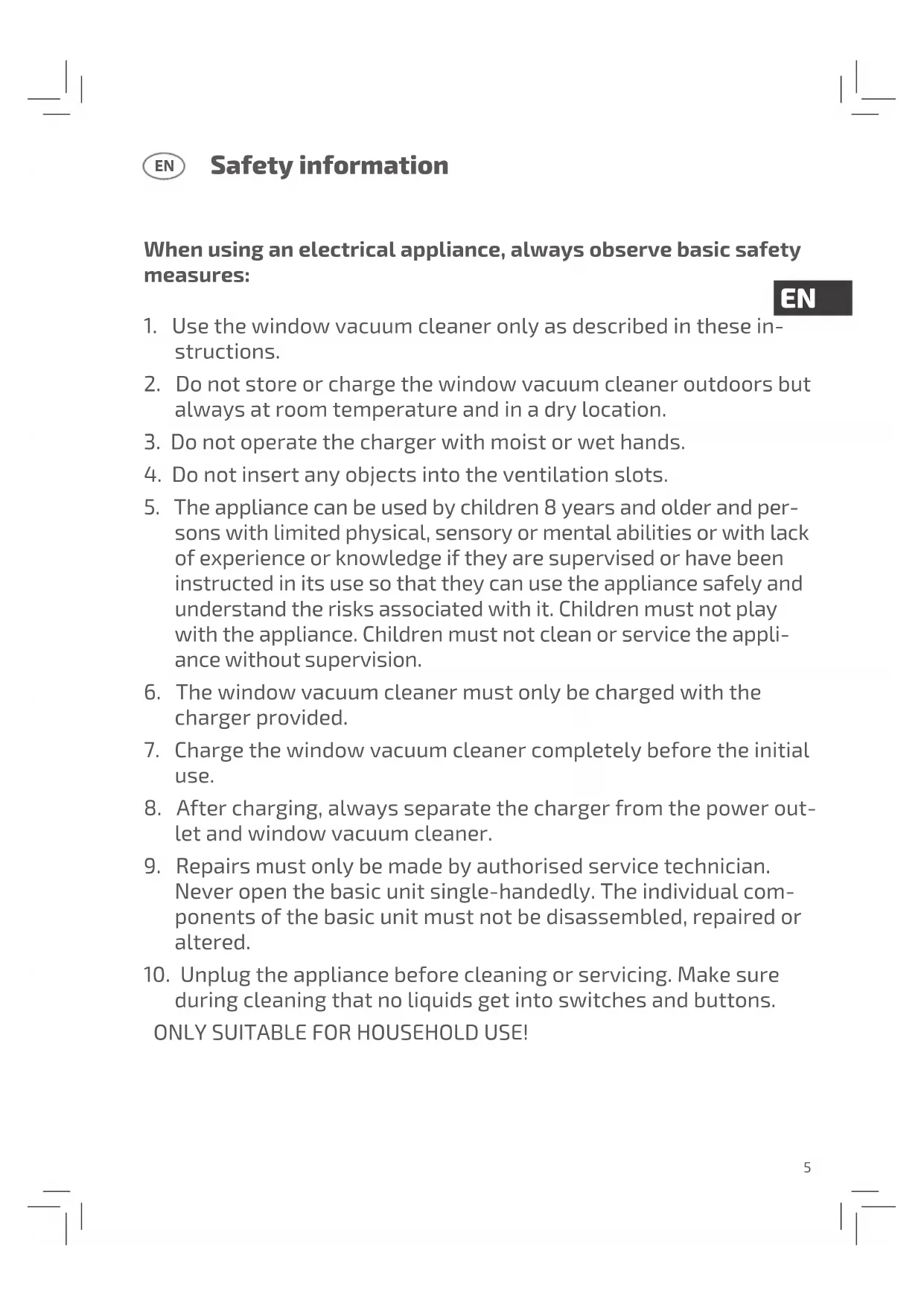 6. The window vacuum cleaner must only be charged with the