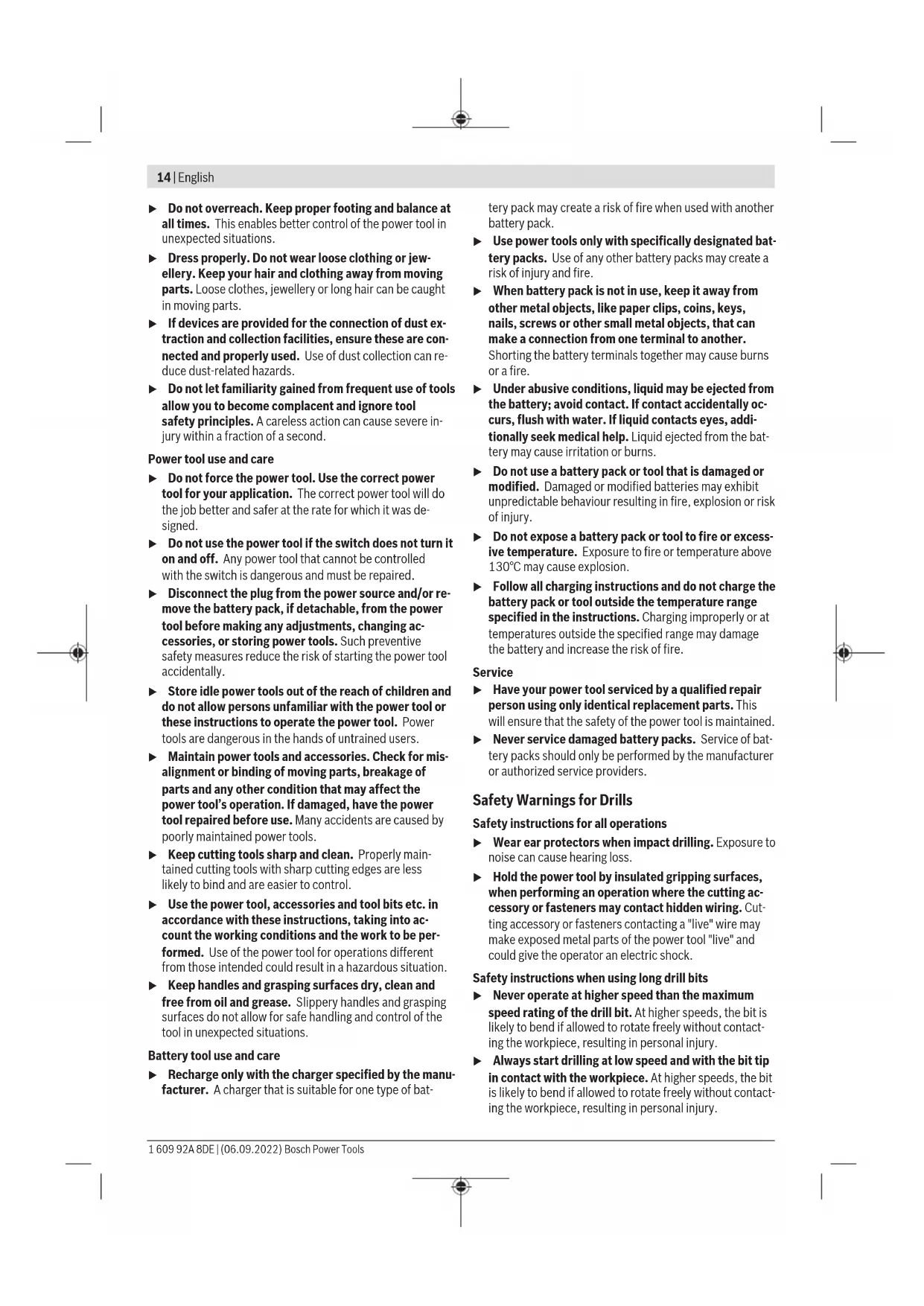 äußeren Abmessung größer als 25cm sind, im Einzel- handelsgeschäft oder in unmittelbarer Nähe hierzu un- entgeltlich zurückzunehmen; die Rücknahme darf nicht an den Kauf eines Elektro- oder Elektronikgerätes ge- knüpft werden und ist auf drei Altgeräte pro Geräteart beschränkt. Der Vertreiber hat beim Abschluss des Kaufvertrags für das neue Elektro- oder Elektronikgerät den Endnutzer über die Möglichkeit zur unentgeltlichen Rückgabe bzw. Abholung des Altgeräts zu informieren und den Endnutzer nach seiner Absicht zu befragen, ob bei der Auslieferung des neuen Ge- räts ein Altgerät zurückgegeben wird. Dies gilt auch bei Vertrieb unter Verwendung von Fernkom- munikationsmitteln, wenn die Lager- und Versandflächen für Elektro- und Elektronikgeräte mindestens 400m² betragen oder die gesamten Lager- und Versandflächen mindestens 800m² betragen, wobei die unentgeltliche Abholung auf Elektro- und Elektronikgeräte der Kategorien 1 (Wärmeüber- träger), 2 (Bildschirmgeräte) und 4 (Großgeräte mit mindes- tens einer äußeren Abmessung über 50cm) beschränkt ist. Für alle übrigen Elektro- und Elektronikgeräte muss der Ver- treiber geeignete Rückgabemöglichkeiten in zumutbarer Ent- fernung zum jeweiligen Endnutzer gewährleisten; das gilt auch für Altgeräte, die in keiner äußeren Abmessung größer als 25cm sind, die der Endnutzer zurückgeben will, ohne ein neues Gerät zu kaufen. Akkus/Batterien: Li-Ion: Bitte beachten Sie die Hinweise im Abschnitt Transport (sie- he „Transport“, Seite12). English Safety Instructions General Power Tool Safety Warnings WARNING Read all safety warnings, instruc- tions, illustrations and specifica- tions provided with this power tool. Failure to follow all in- structions listed below may result in electric shock, fire and/ or serious injury. Save all warnings and instructions for future reference. The term "power tool" in the warnings refers to your mains- operated (corded) power tool or battery-operated (cord- less) power tool. Work area safety u Keep work area clean and well lit. Cluttered or dark areas invite accidents. u Do not operate power tools in explosive atmospheres, such as in the presence of flammable liquids, gases or dust. Power tools create sparks which may ignite the dust or fumes. u Keep children and bystanders away while operating a power tool. Distractions can cause you to lose control. Electrical safety u Power tool plugs must match the outlet. Never modify the plug in any way. Do not use any adapter plugs with earthed (grounded) power tools. Unmodified plugs and matching outlets will reduce risk of electric shock. u Avoid body contact with earthed or grounded sur- faces, such as pipes, radiators, ranges and refrigerat- ors. There is an increased risk of electric shock if your body is earthed or grounded. u Do not expose power tools to rain or wet conditions. Water entering a power tool will increase the risk of elec- tric shock. u Do not abuse the cord. Never use the cord for carry- ing, pulling or unplugging the power tool. Keep cord away from heat, oil, sharp edges or moving parts. Damaged or entangled cords increase the risk of electric shock. u When operating a power tool outdoors, use an exten- sion cord suitable for outdoor use. Use of a cord suit- able for outdoor use reduces the risk of electric shock. u If operating a power tool in a damp location is un- avoidable, use a residual current device (RCD) protec- ted supply. Use of an RCD reduces the risk of electric shock. Personal safety u Stay alert, watch what you are doing and use common sense when operating a power tool. Do not use a power tool while you are tired or under the influence of drugs, alcohol or medication. A moment of inatten- tion while operating power tools may result in serious per- sonal injury. u Use personal protective equipment. Always wear eye protection. Protective equipment such as a dust mask, non-skid safety shoes, hard hat or hearing protection used for appropriate conditions will reduce personal in- juries. u Prevent unintentional starting. Ensure the switch is in the off-position before connecting to power source and/or battery pack, picking up or carrying the tool. Carrying power tools with your finger on the switch or en- ergising power tools that have the switch on invites acci- dents. u Remove any adjusting key or wrench before turning the power tool on. A wrench or a key left attached to a rotating part of the power tool may result in personal in- jury. Bosch Power Tools 1 609 92A 8DE | (06.09.2022)14 | English u Do not overreach. Keep proper footing and balance at all times. This enables better control of the power tool in unexpected situations. u Dress properly. Do not wear loose clothing or jew- ellery. Keep your hair and clothing away from moving parts. Loose clothes, jewellery or long hair can be caught in moving parts. u If devices are provided for the connection of dust ex- traction and collection facilities, ensure these are con- nected and properly used. Use of dust collection can re- duce dust-related hazards. u Do not let familiarity gained from frequent use of tools allow you to become complacent and ignore tool safety principles. A careless action can cause severe in- jury within a fraction of a second. Power tool use and care u Do not force the power tool. Use the correct power tool for your application. The correct power tool will do the job better and safer at the rate for which it was de- signed. u Do not use the power tool if the switch does not turn it on and off. Any power tool that cannot be controlled with the switch is dangerous and must be repaired. u Disconnect the plug from the power source and/or re- move the battery pack, if detachable, from the power tool before making any adjustments, changing ac- cessories, or storing power tools. Such preventive safety measures reduce the risk of starting the power tool accidentally. u Store idle power tools out of the reach of children and do