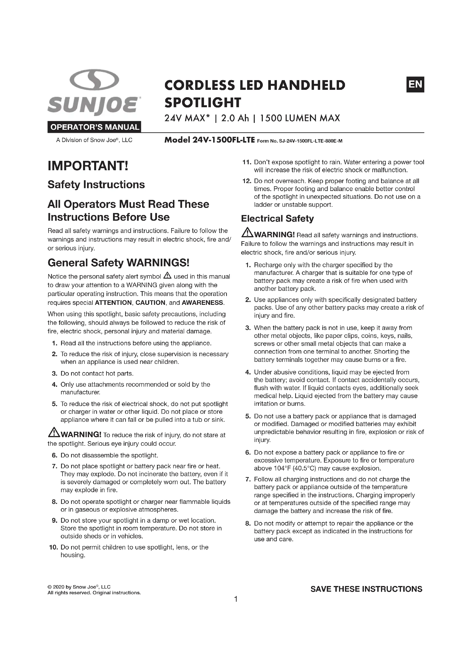 24V1500FLLTE - Lighting Sun Joe - Free user manual and instructions
