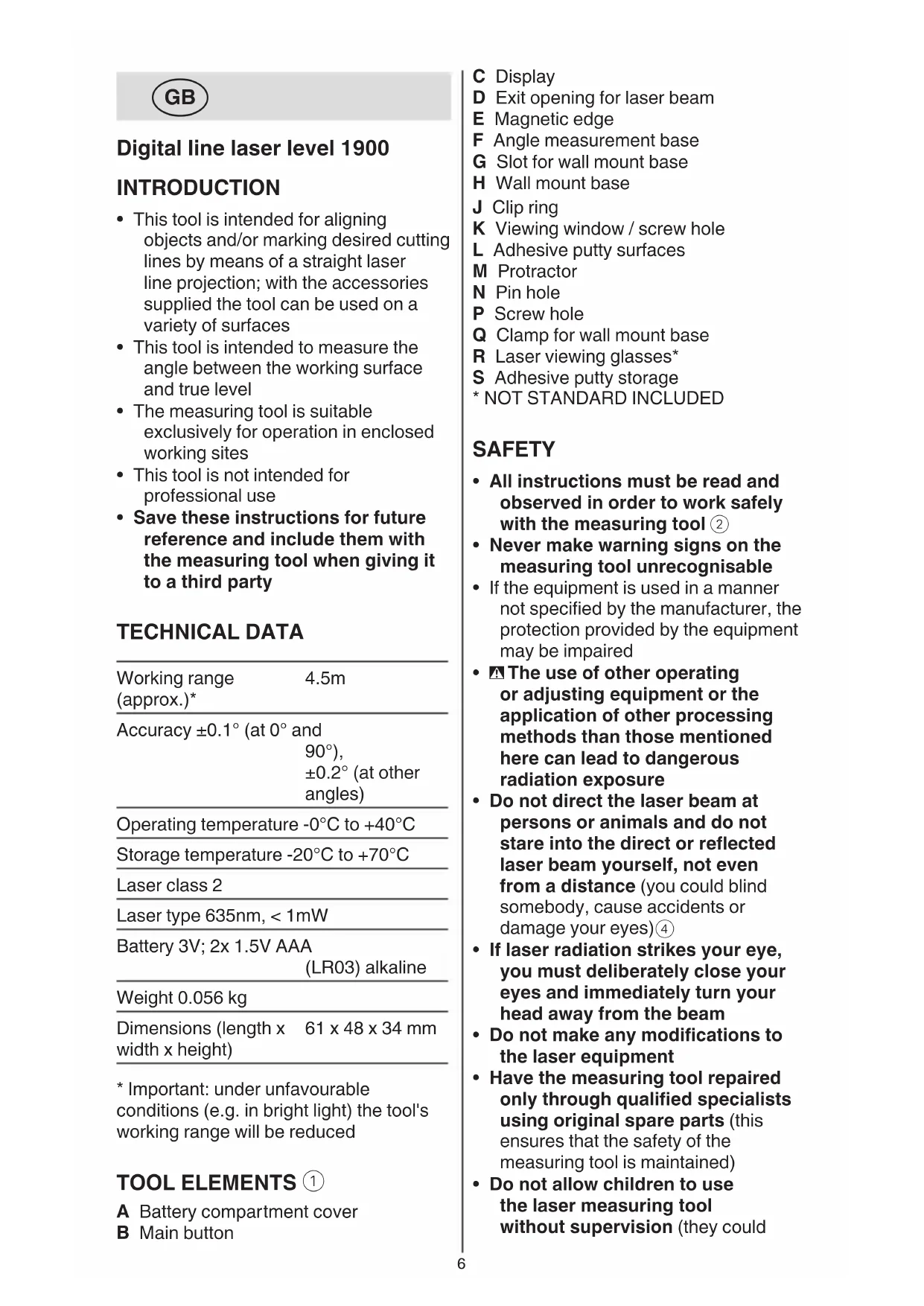 - Save these instructions for future reference and include them with the measuring tool when giving it to a third party TECHNICAL DATA Working range (approx.)* 4.5m Accuracy ±0.1° (at 0° and 90°), ±0.2° (at other angles) Operating temperature -0°C to +40°C Storage temperature -20°C to +70°C Laser class 2 Laser type 635nm, < 1mW Battery 3V; 2x 1.5V AAA (LR03) alkaline Weight 0.056 kg Dimensions (length x width x height) 61 x 48 x 34 mm