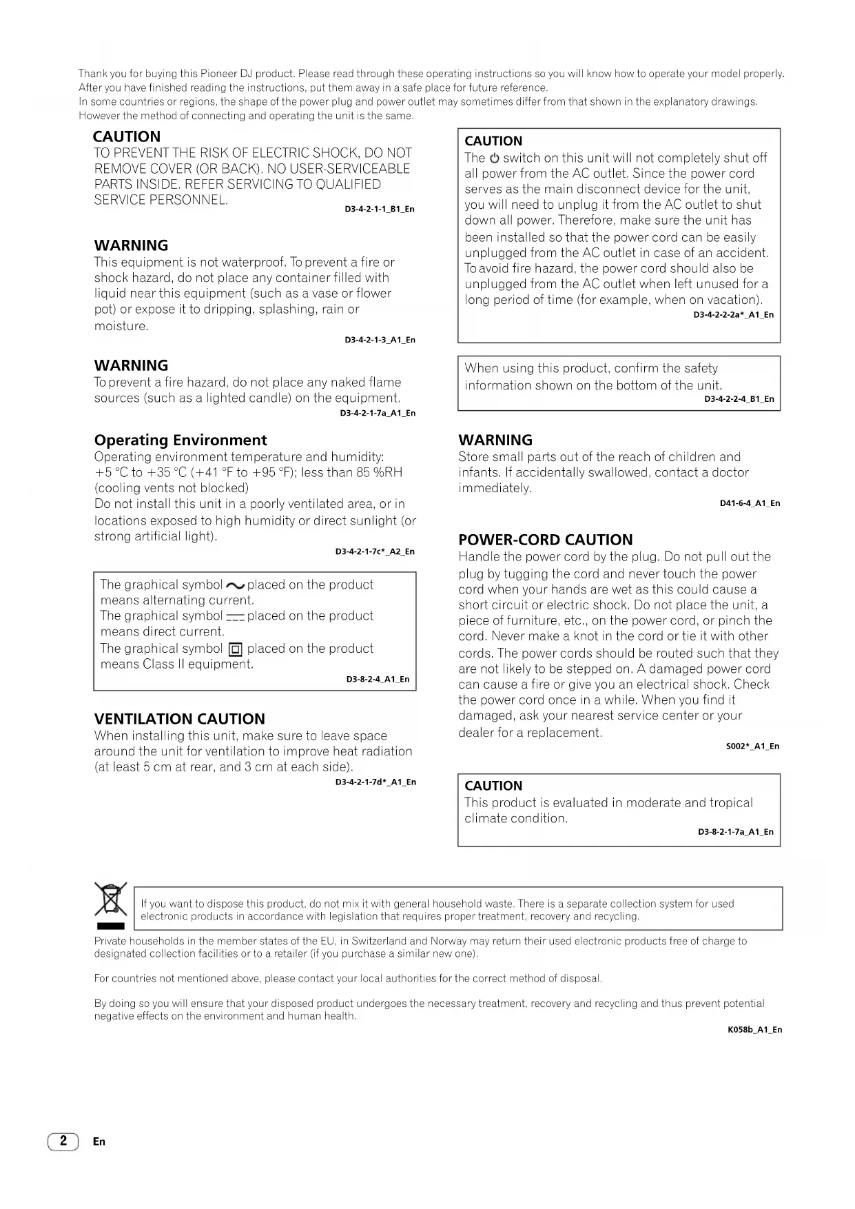 SERVICE PERSONNEL. D3-4-2-1-1_B1_En WARNING This equipment is not waterproof. To prevent a fire or shock hazard, do not place any container filled with liquid near this equipment (such as a vase or flower pot) or expose it to dripping, splashing, rain or moisture. D3-4-2-1-3_A1_En WARNING To prevent a fire hazard, do not place any naked flame sources (such as a lighted candle) on the equipment. D3-4-2-1-7a_A1_En Operating Environment Operating environment temperature and humidity: +5 °C to +35 °C (+41 °F to +95 °F); less than 85 %RH (cooling vents not blocked) Do not install this unit in a poorly ventilated area, or in locations exposed to high humidity or direct sunlight (or strong artificial light). D3-4-2-1-7c*_A2_En CAUTION The switch on this unit will not completely shut off all power from the AC outlet. Since the power cord serves as the main disconnect device for the unit, you will need to unplug it from the AC outlet to shut down all power. Therefore, make sure the unit has been installed so that the power cord can be easily unplugged from the AC outlet in case of an accident. To avoid fire hazard, the power cord should also be unplugged from the AC outlet when left unused for a long period of time (for example, when on vacation). D3-4-2-2-2a*_A1_En When using this product, confirm the safety information shown on the bottom of the unit. D3-4-2-2-4_B1_En POWER-CORD CAUTION Handle the power cord by the plug. Do not pull out the plug by tugging the cord and never touch the power cord when your hands are wet as this could cause a short circuit or electric shock. Do not place the unit, a piece of furniture, etc., on the power cord, or pinch the cord. Never make a knot in the cord or tie it with other cords. The power cords should be routed such that they are not likely to be stepped on. A damaged power cord can cause a fire or give you an electrical shock. Check the power cord once in a while. When you find it damaged, ask your nearest service center or your dealer for a replacement. S002*_A1_En VENTILATION CAUTION When installing this unit, make sure to leave space around the unit for ventilation to improve heat radiation (at least 5 cm at rear, and 3 cm at each side). D3-4-2-1-7d*_A1_En If you want to dispose this product, do not mix it with general household waste. There is a separate collection system for used electronic products in accordance with legislation that requires proper treatment, recovery and recycling. Private households in the member states of the EU, in Switzerland and Norway may return their used electronic products free of charge to designated collection facilities or to a retailer (if you purchase a similar new one). For countries not mentioned above, please contact your local authorities for the correct method of disposal. By doing so you will ensure that your disposed product undergoes the necessary treatment, recovery and recycling and thus prevent potential negative effects on the environment and human health. K058b_A1_En WARNING Store small parts out of the reach of children and infants. If accidentally swallowed, contact a doctor immediately. D41-6-4_A1_En The graphical symbol placed on the product means alternating current. The graphical symbol placed on the product means direct current. The graphical symbol placed on the product means Class II equipment. D3-8-2-4_A1_En CAUTION This product is evaluated in moderate and tropical climate condition. D3-8-2-1-7a_A1_En3