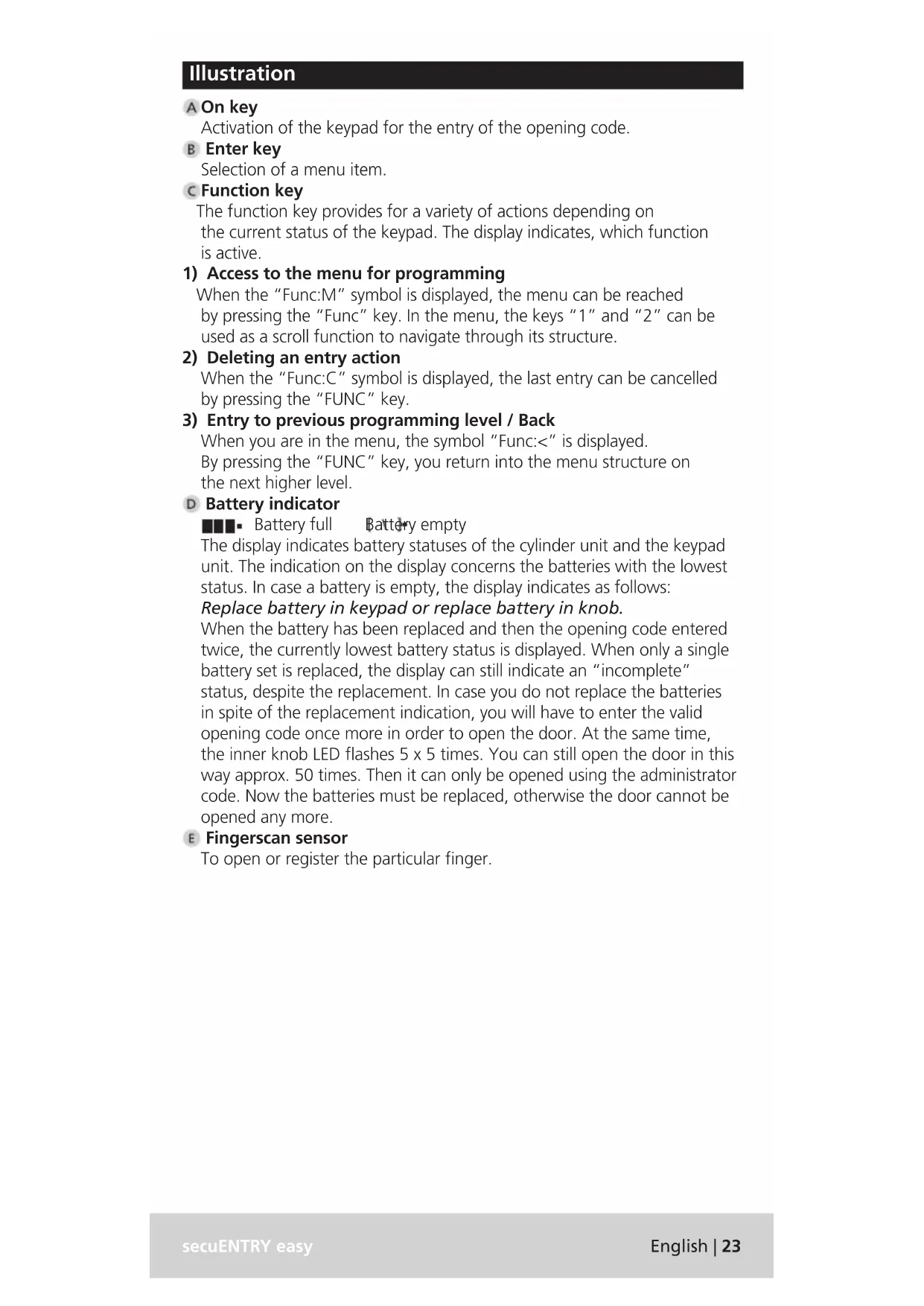 When you are in the menu, the symbol “Func:<” is displayed. By pressing the “FUNC” key, you return into the menu structure on the next higher level. Battery indicator Battery full Battery empty The display indicates battery statuses of the cylinder unit and the keypad unit. The indication on the display concerns the batteries with the lowest status. In case a battery is empty, the display indicates as follows: Replace battery in keypad or replace battery in knob. When the battery has been replaced and then the opening code entered twice, the currently lowest battery status is displayed. When only a single battery set is replaced, the display can still indicate an “incomplete” status, despite the replacement. In case you do not replace the batteries in spite of the replacement indication, you will have to enter the valid opening code once more in order to open the door. At the same time, the inner knob LED ashes 5 x 5 times. You can still open the door in this way approx. 50 times. Then it can only be opened using the administrator code. Now the batteries must be replaced, otherwise the door cannot be opened any more. Fingerscan sensor To open or register the particular nger.24 | English secuENTRY easy Dear customer, Thank you very much for your decision for the secuENTRY electronic lock system manufactured by BURG-WÄCHTER. This system has been developed and manufactured using the latest technical potential and satises high security requirements. The electronic cylinder can be used easily without any drilling in any door prepared for prole cylinder up to a door thickness of 118 mm (59 / 59, measured at the central detent bolt), and is perfectly appropriate for new installation as well as for retrotting. Depending on the specic system, various opening media are available. With systems containing a keypad, user administration is additionally integrated. You can nd out more on the following pages. Remove the battery protection strip from the inner knob in order to energise the cylinder. Important: Please read the entire User Manual before you start programming. We hope you enjoy your new locking system. General information about secuENTRY easy secuENTRY is available in two equipment congurations: