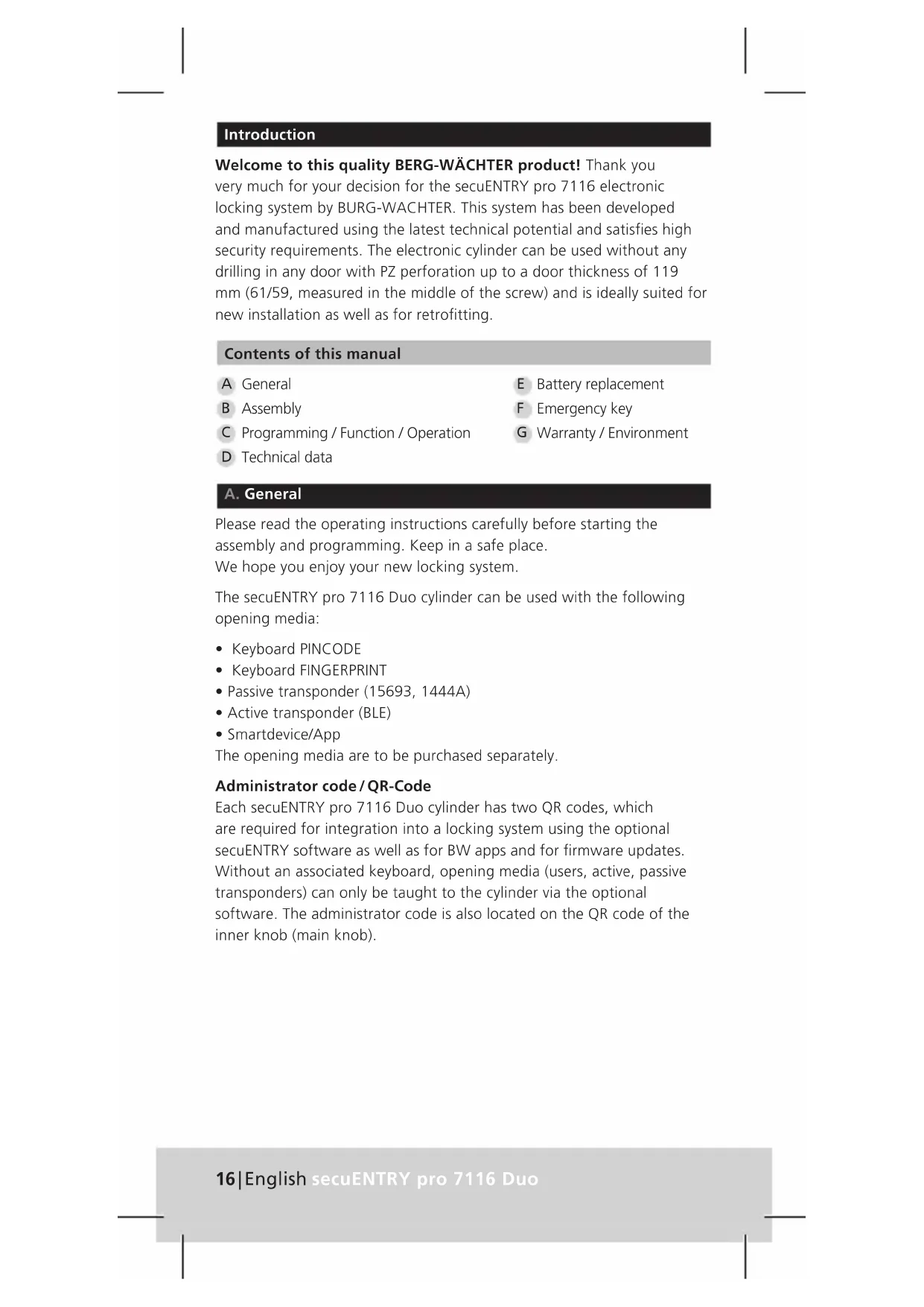 Technical data A. General Please read the operating instructions carefully before starting the assembly and programming. Keep in a safe place. We hope you enjoy your new locking system. The secuENTRY pro 7116 Duo cylinder can be used with the following opening media: