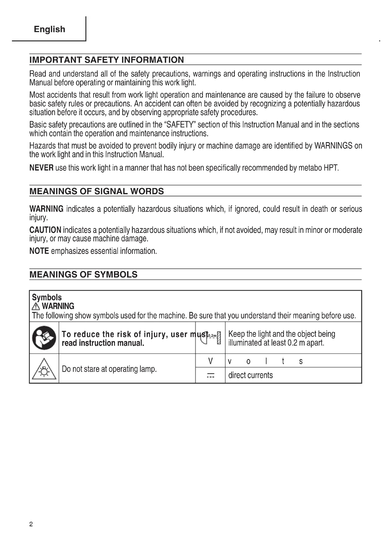 Symbols WARNING The following show symbols used for the machine. Be sure that you understand their meaning before use. To reduce the risk of injury, user must read instruction manual. 0,2m Keep the light and the object being illuminated at least 0.2 m apart. Do not stare at operating lamp. Vvolts
