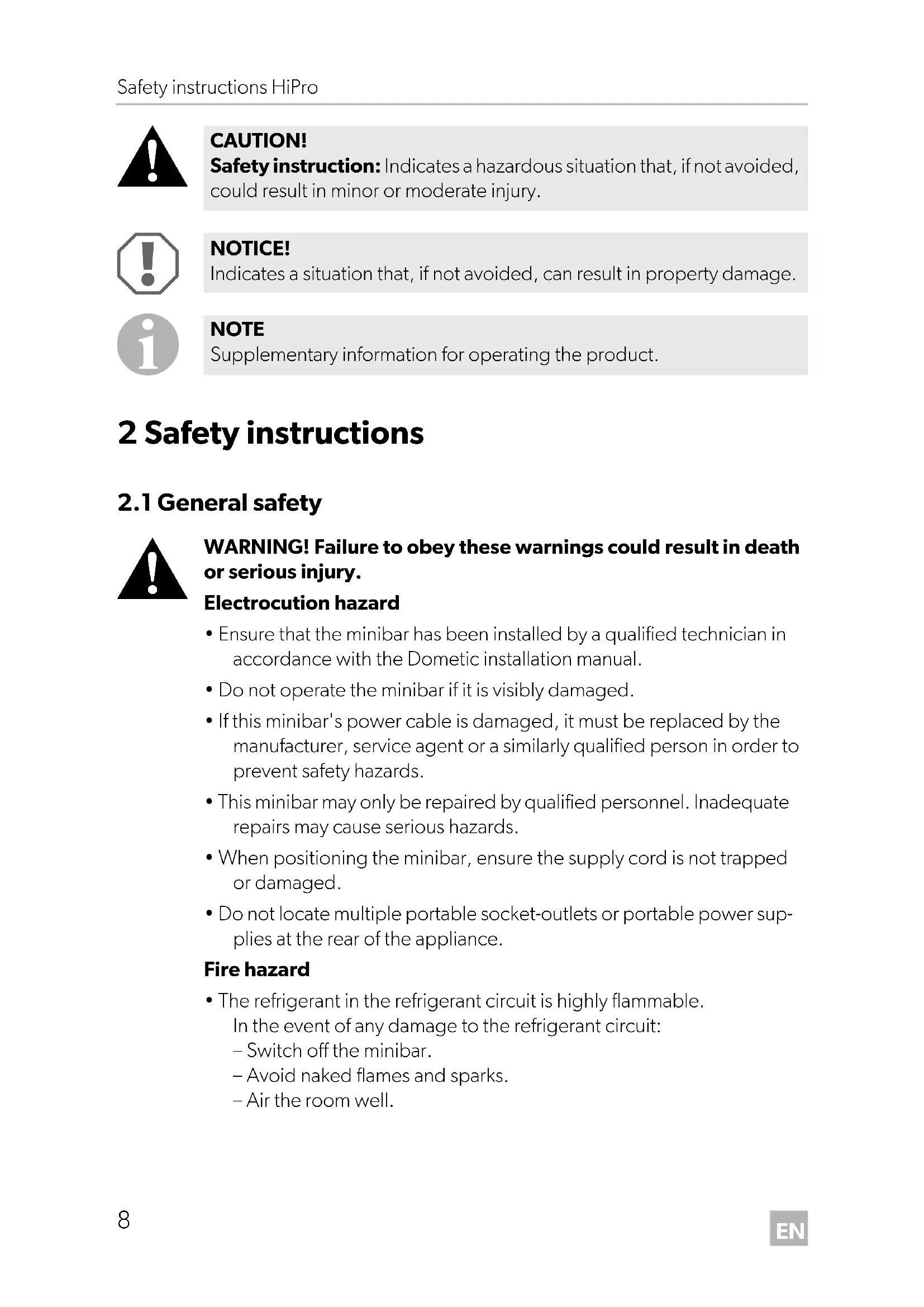 - The refrigerant in the refrigerant circuit is highly flammable. In the event of any damage to the refrigerant circuit: – Switch off the minibar. – Avoid naked flames and sparks. – Air the room well. CAUTION! Safety instruction: Indicates a hazardous situation that, if not avoided, could result in minor or moderate injury. NOTICE! Indicates a situation that, if not avoided, can result in property damage. NOTE Supplementary information for operating the product. DometicHiPro30-40_OPM_4445103227_EMEA25_xxxx-xx-xx.book Seite 8 Freitag, 16. April 2021 2:47 14EN HiPro Safety instructions