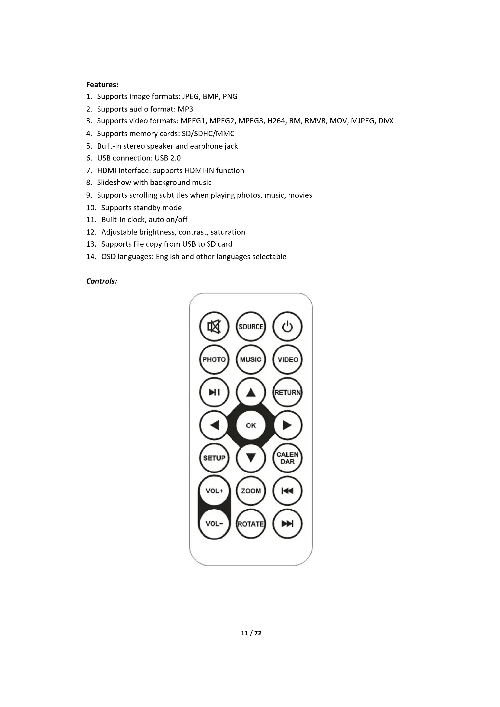 Play or pause RETURN Back to previous screen Move up/down/left/right cursor keys. OK Confirmation SETUP Setup menu CALENDAR Calendar function directly VOL+ VOL- Volume adjustment ZOOM Enlarge the photo in photo play mode ROTATE Rotate the photo in photo play mode Select previous or next file Main Menu: Supports SD/SDHC/MMC and USB 2.0. Press to access photo, music, video, calendar and settings menus. Press OK button to confirm selection. Note: Make sure there are supported picture, music or video files on the memory card or USB device.13 / 72 Picture Mode: Highlight Photo from the main menu, press OK to select the USB or memory card for playback and press RETURN to access thumbnail mode. Press to select the photo for playback and press OK to confirm.