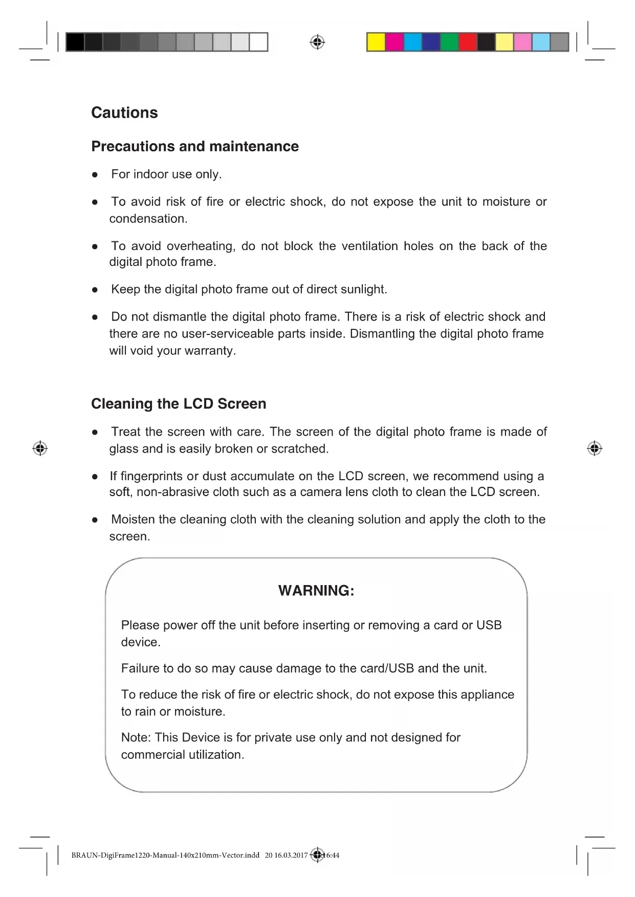 Please power off the unit before inserting or removing a card or USB device. Failure to do so may cause damage to the card/USB and the unit. To reduce the risk of fire or electric shock, do not expose this appliance to rain or moisture. Note: This Device is for private use only and not designed for commercial utilization. BRAUN-DigiFrame1220-Manual-140x210mm-Vector.indd 20 16.03.2017 13:16:441 Introduction: Thank you for purchasing the BRAUN DigiFrame 1220. The product is designed to allow quick and easy viewing of photos taken from your digital camera, mobile phone, or from a memory storage card. Please read this user manual carefully to learn the correct way to use the digital photo frame. BRAUN-DigiFrame1220-Manual-140x210mm-Vector.indd 21 16.03.2017 13:16:442 Features: