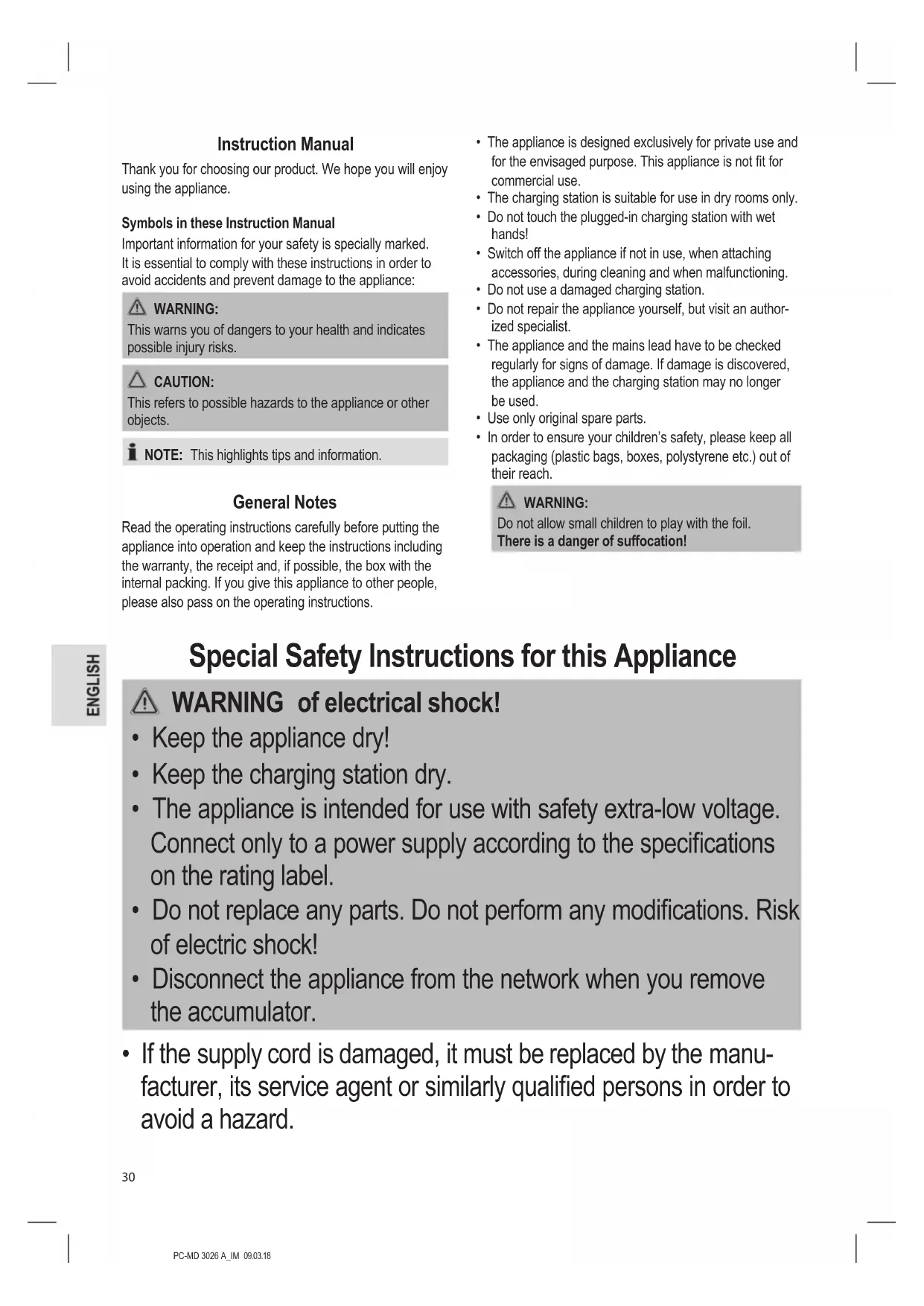 - If the supply cord is damaged, it must be replaced by the manu- facturer, its service agent or similarly qualied persons in order to avoid a hazard.PC-MD 3026 A_IM 09.03.18