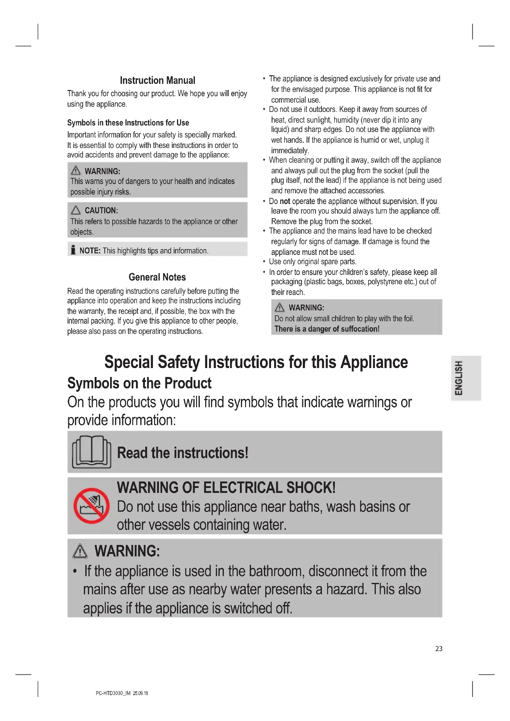 Read the operating instructions carefully before putting the appliance into operation and keep the instructions including the warranty, the receipt and, if possible, the box with the internal packing. If you give this appliance to other people, please also pass on the operating instructions.