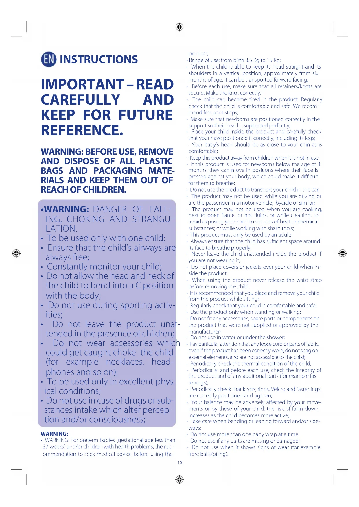 Always ensure that the child has sufficient space around its face to breathe properly; - Never leave the child unattended inside the product if you are not wearing it;