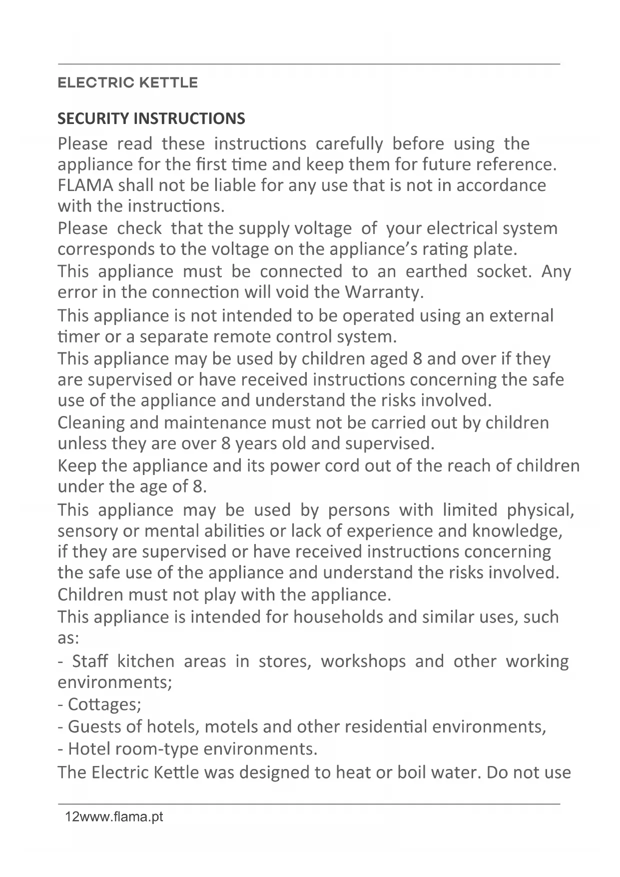 AMBIENTE Este símbolo indica la recogida separada de equipos eléctricos y electrónicos. El objevo prioritario de la recogida de estos residuos es reducir la candad a eliminar, promover la reulización, el reciclado y otras formas de valorización, para reducir sus efectos negavos sobre el medio ambiente. Cuando este aparato esté fuera de uso, no debe desecharse con los demás residuos urbanos no diferenciados. El usuario es responsable de proceder a su entrega gratuita en las instalaciones de re- cogida selecva existentes para ello. La recuperación de los equipamientos fuera de uso también podrá ser realizada por los puntos de venta, en la compra de un equi- pamiento nuevo que sea equivalente y que desempeñe las mismas funciones. Para obtener información más detallada so- bre los locales de recogida debe dirigirse a su Ayuntamiento o a un punto de venta de estos equipamientos.12 www.ama.pt ELECTRIC KETTLE SECURITY INSTRUCTIONS Please read these instrucons carefully before using the appliance for the rst me and keep them for future reference. FLAMA shall not be liable for any use that is not in accordance with the instrucons. Please check that the supply voltage of your electrical system corresponds to the voltage on the appliance’s rang plate. This appliance must be connected to an earthed socket. Any error in the connecon will void the Warranty. This appliance is not intended to be operated using an external mer or a separate remote control system. This appliance may be used by children aged 8 and over if they are supervised or have received instrucons concerning the safe use of the appliance and understand the risks involved. Cleaning and maintenance must not be carried out by children unless they are over 8 years old and supervised. Keep the appliance and its power cord out of the reach of children under the age of 8. This appliance may be used by persons with limited physical, sensory or mental abilies or lack of experience and knowledge, if they are supervised or have received instrucons concerning the safe use of the appliance and understand the risks involved. Children must not play with the appliance. This appliance is intended for households and similar uses, such as: - Sta kitchen areas in stores, workshops and other working environments; - Coages; - Guests of hotels, motels and other residenal environments, - Hotel room-type environments. The Electric Kele was designed to heat or boil water. Do not use13 English any other liquid. Only use the power base provided with the Electric Kele. To ll the Kele, always remove it from the power base, to prevent water from overowing onto it. Never ll the Kele above the maximum level indicator, marked on the water level indicator, as boiling water may spill out. Never switch on the Electric Kele without water in it. Never switch on the Electric Kele with the lid open. Never run the Electric Kele when the power base is wet. When it is switched on, the body of the Kele heats up. Use only the handle of the Electric Kele to move it around. If the Kele is too hot, allow it to cool down before lling it with cold water. Please disconnect the appliance from the power supply by removing the plug from the xed power socket aer each use and when cleaning. Clean the outside of the Electric Kele and the power base with a dry, absorbent cloth. Never immerse the kele or the power base in water or any other liquid for cleaning. Do not use the appliance if it is not working properly, or if it is in any way damaged. Any intervenon other than cleaning must be carried out by an Authorized FLAMA Technical Assistance Service. Do not use the appliance if the power cord or plug are damaged. Do not aempt to replace the power cord or plug as this is a dangerous operaon. Have them replaced immediately at an Authorized Flama Technical Assistance Service. This product complies with the Low-Voltage and Electromagnec Compability Direcves. This instrucon manual is also available in PDF format at www. ama.pt.14 www.ama.pt DESCRIPTION