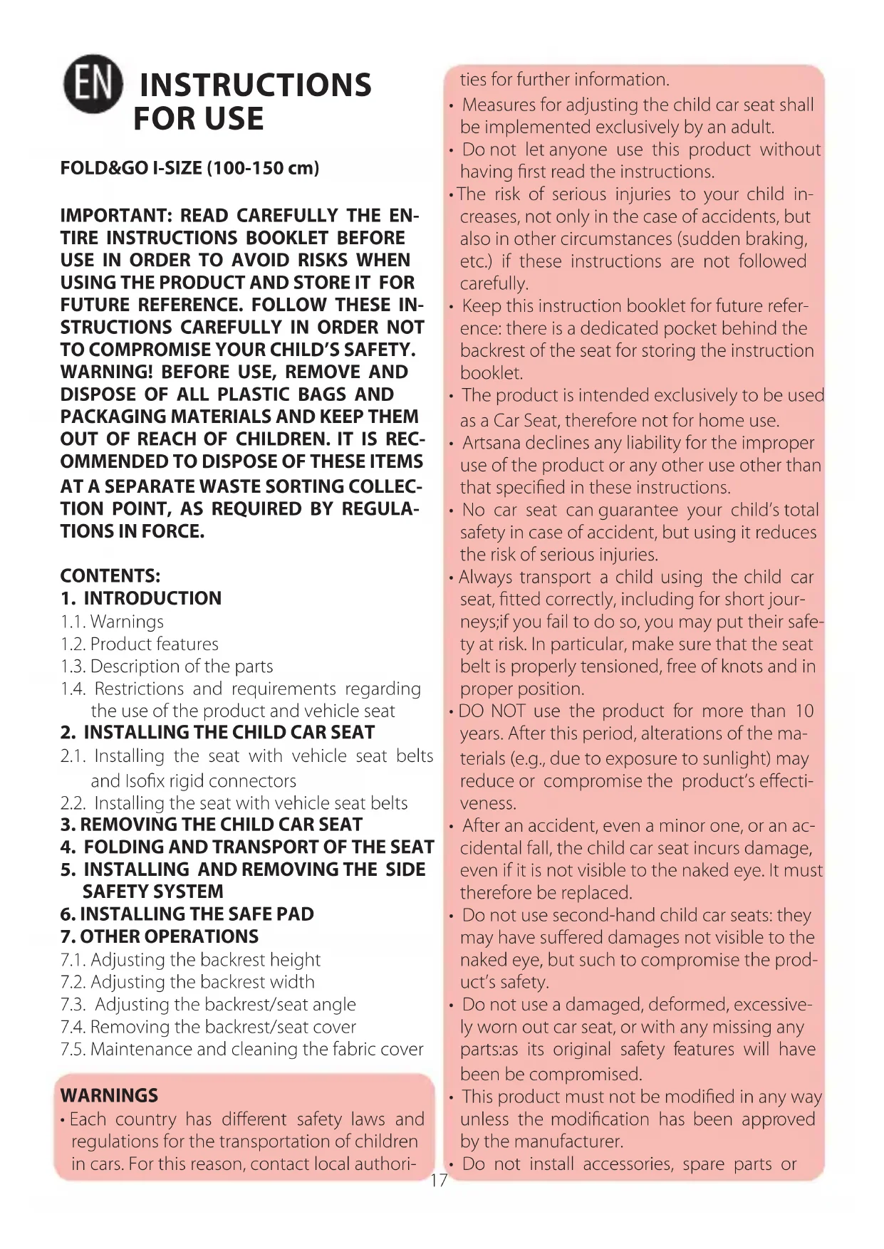 1.1. Warnings 1.2. Product features 1.3. Description of the parts 1.4. Restrictions and requirements regarding the use of the product and vehicle seat