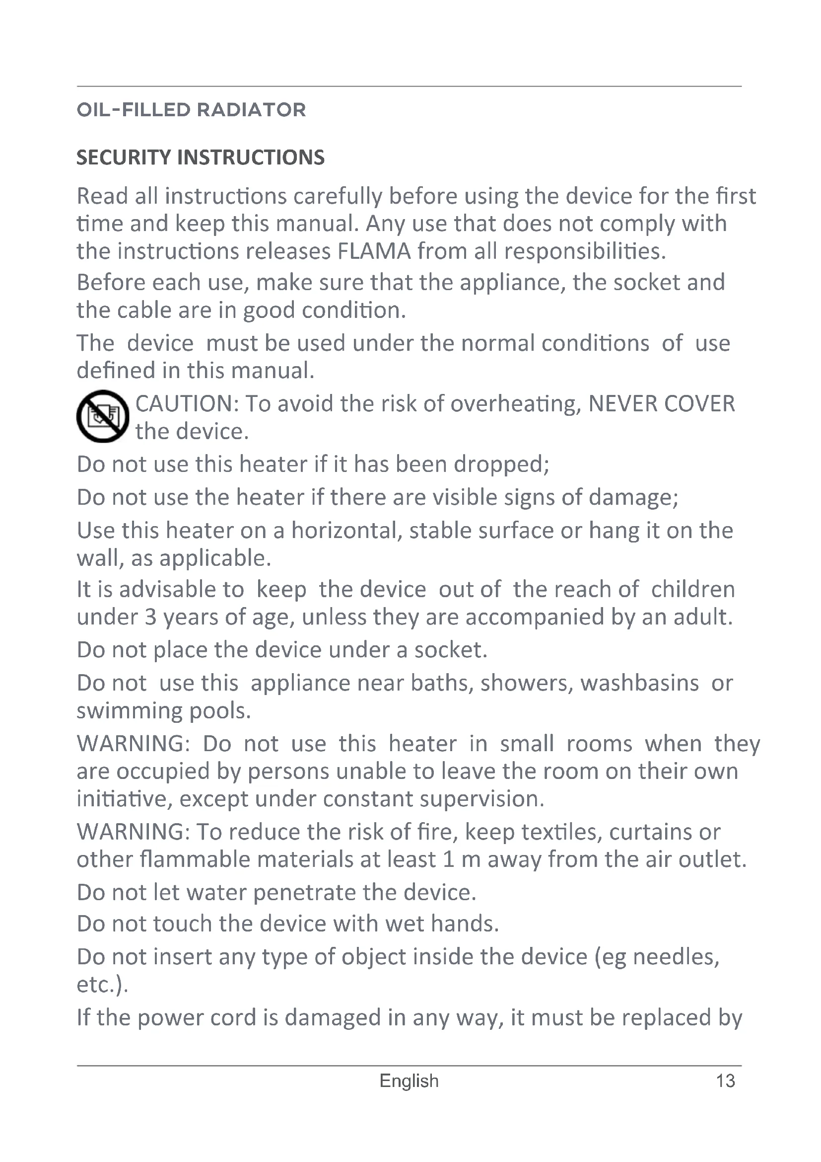 English OIL-FILLED RADIATOR SECURITY INSTRUCTIONS Read all instrucons carefully before using the device for the rst me and keep this manual. Any use that does not comply with the instrucons releases FLAMA from all responsibilies. Before each use, make sure that the appliance, the socket and the cable are in good condion. The device must be used under the normal condions of use dened in this manual. CAUTION: To avoid the risk of overheang, NEVER COVER the device. Do not use this heater if it has been dropped; Do not use the heater if there are visible signs of damage; Use this heater on a horizontal, stable surface or hang it on the wall, as applicable. It is advisable to keep the device out of the reach of children under 3 years of age, unless they are accompanied by an adult. Do not place the device under a socket. Do not use this appliance near baths, showers, washbasins or swimming pools.