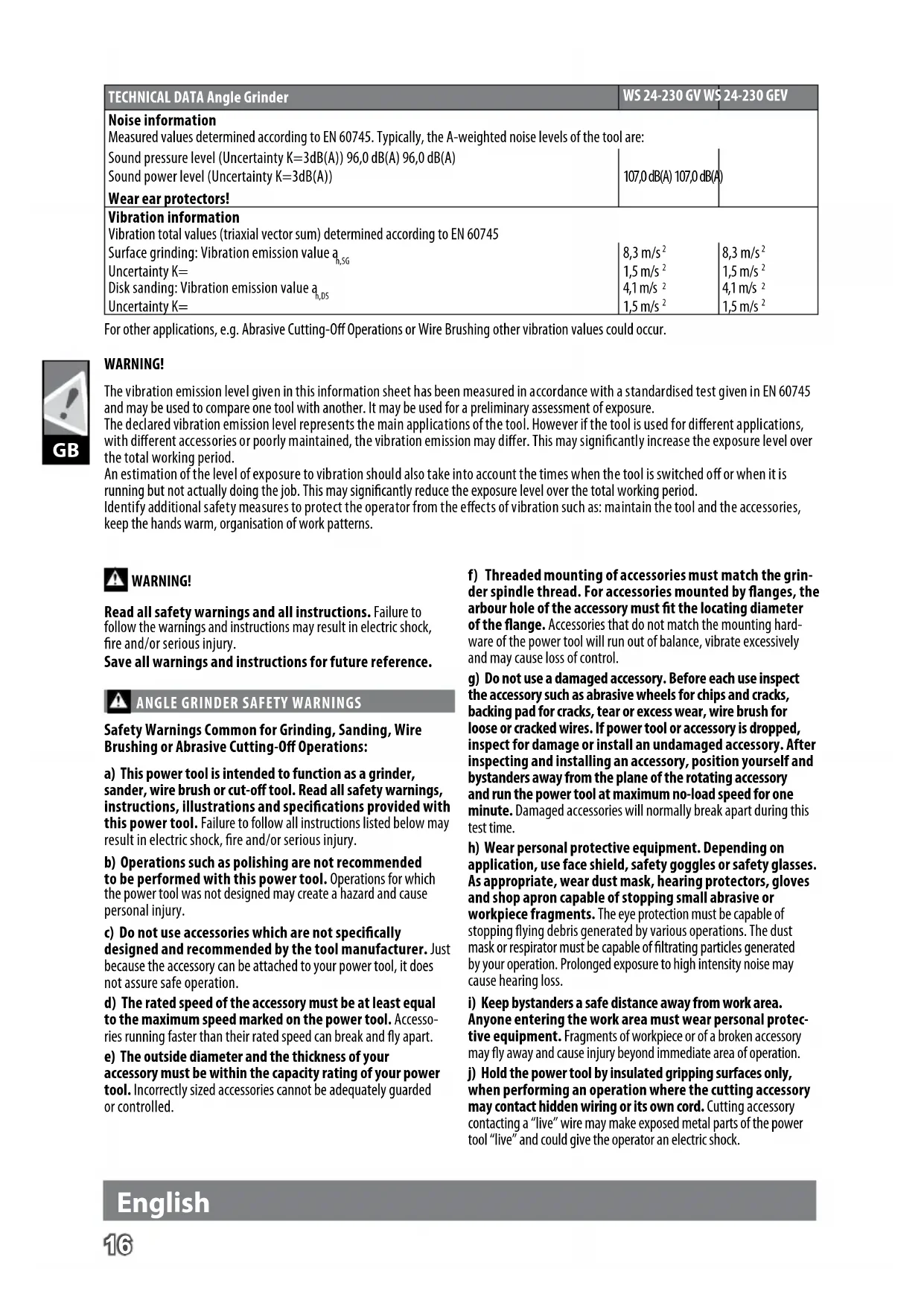 WS 22-180, WS 22-180 E, WS 22-230, WS 22-230 E, WS 24-230 GV, WS 24-230 GEVTechnical Data,Safety Instructions, Specied Conditions of Use, EC-Declaration of Conformity, Mains connection, Maintenance, Symbols Please read and save these instructions! English